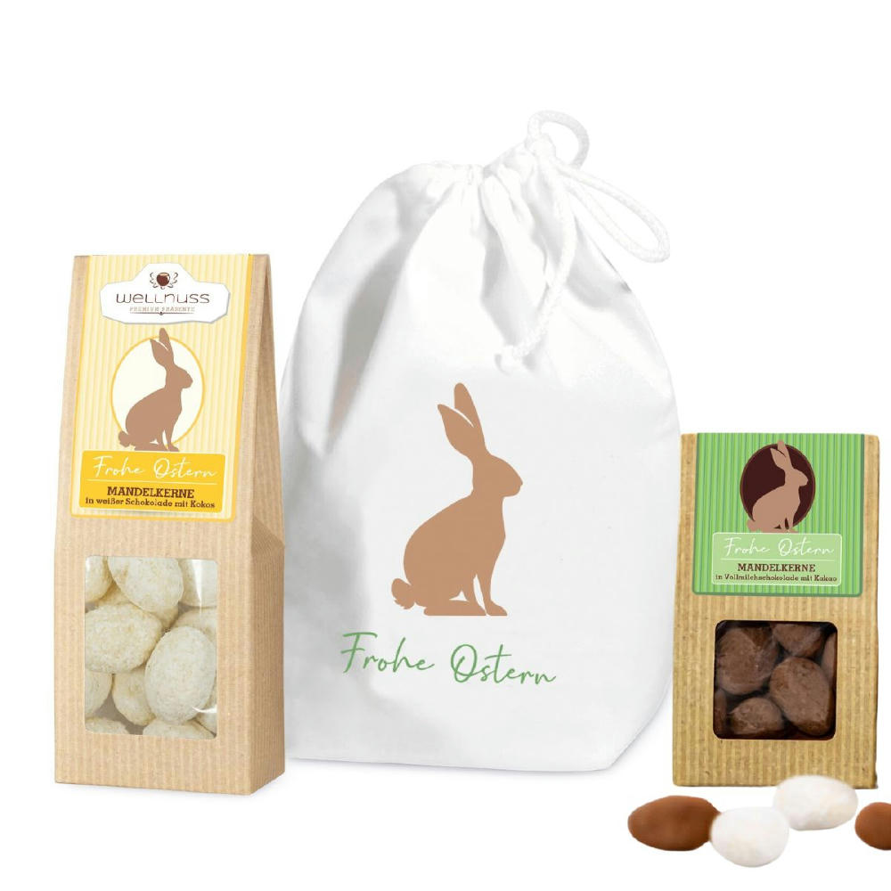 Ab 100 Stück mit Ihrem Motiv auf dem Baumwollsäckchen: Beweisen Sie Ihren Geschmackssinn und verschenken Sie eine Oster-Edition der Trüffelmandeln mit Kakao und Kokosmandeln mit weißer Schokolade. Deren perfekte Osterei-Form wird abgerundet mit Oster-Motiven auf der Faltschachtel. Sie suchen eine andere Größe? Dieses Premium Präsent ist auch mit 1, 2 oder 3 Faltschachteln erhältlich.