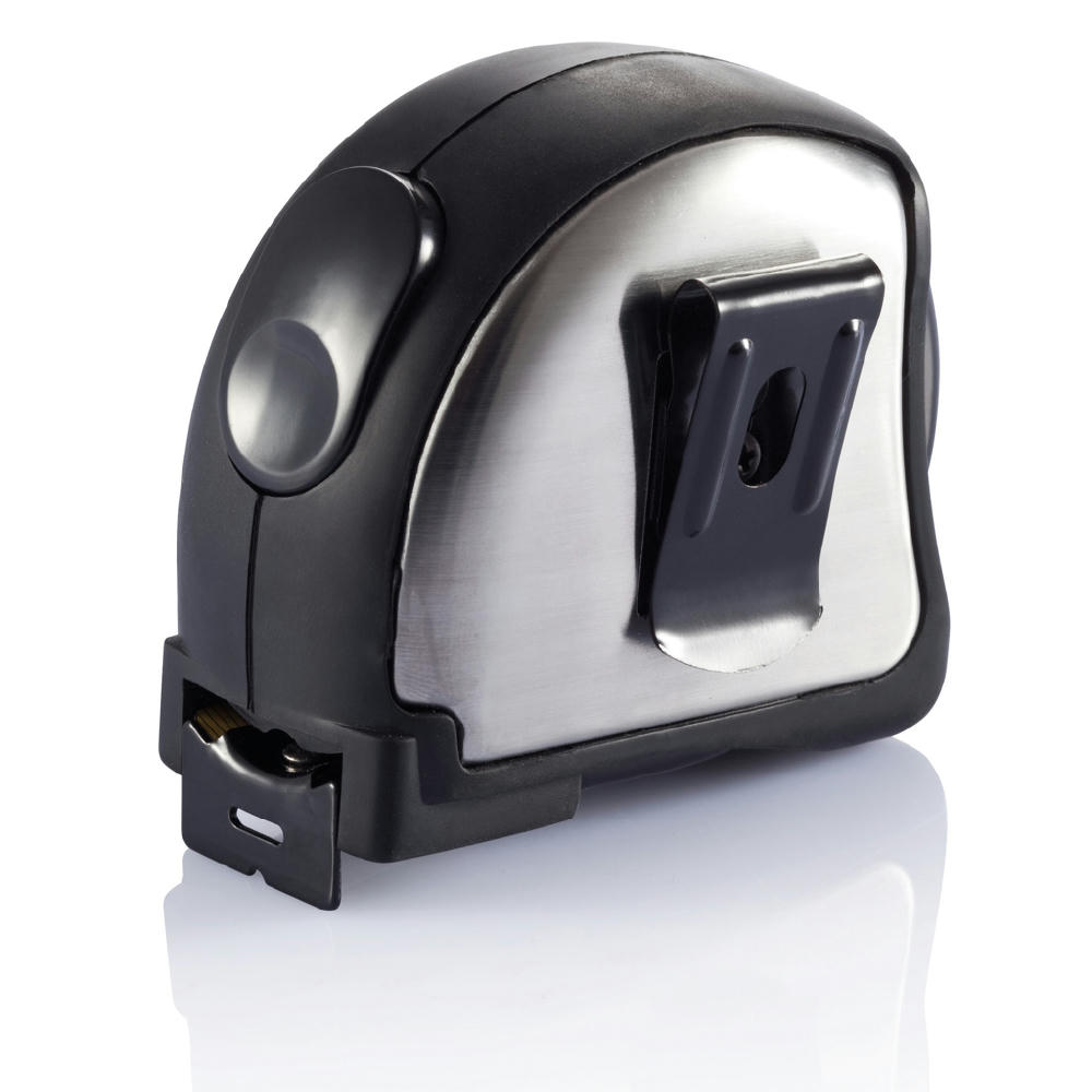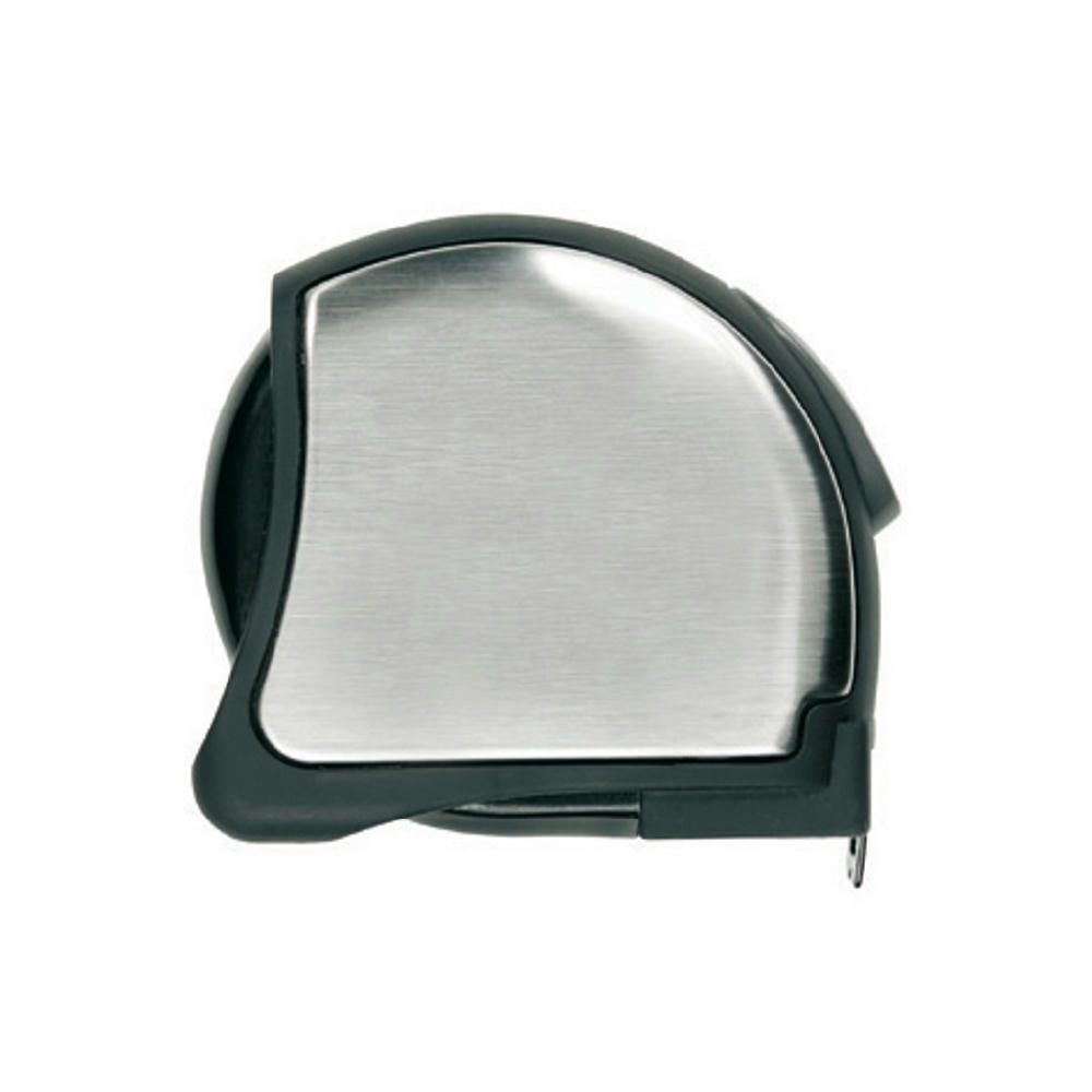 Edelstahlmaßband mit Griffigkeit durch Weichgummi. Metrisch, mit Stopper und Gürtelclip.