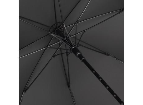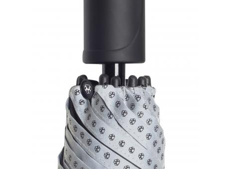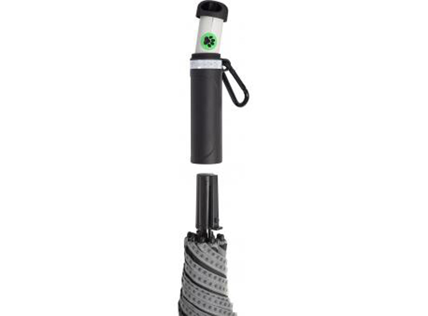 Automatik-Gästeschirm mit abnehmbarem Soft-Feel-Griff mit silber reflektierendem Streifen, befüllt mit 15 Hundekotbeuteln. Windproof-System für eine maximale Gestell-Flexibilität, flexible Fiberglasschienen, Fiberglasstock bedruckt mit Pfotenabdrücken in silber. Griff mit Karabinerhaken zur Befestigung an Gürtel, Tasche oder Hundeleine, Deckel zum Nachfüllen abschraubbar, Auslösetaste mit Pfoten-Sticker und Werbeanbringungsmöglichkeit.