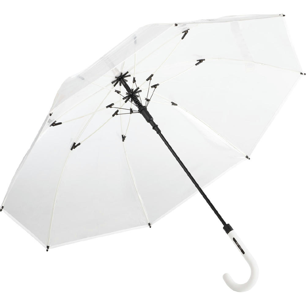 Ansprechender Automatik-Stockschirm mit transparentem Bezug und farbigen Details. Komfortable Automatik-Funktion zum schnellen Öffnen, hochwertiges Windproof-PLUS-System für eine maximale Gestell-Flexibilität bei stärkeren Windböen, flexible Fiberglasschienen, farblich aufeinander abgestimmte Design-Elemente, handsympathischer Soft-Touch-Rundhakengriff mit integrierter Auslösetaste und Werbeanbringungsmöglichkeit, höherer Korrosionsschutz durch schwarze Galvanisierung des Stahlstocks