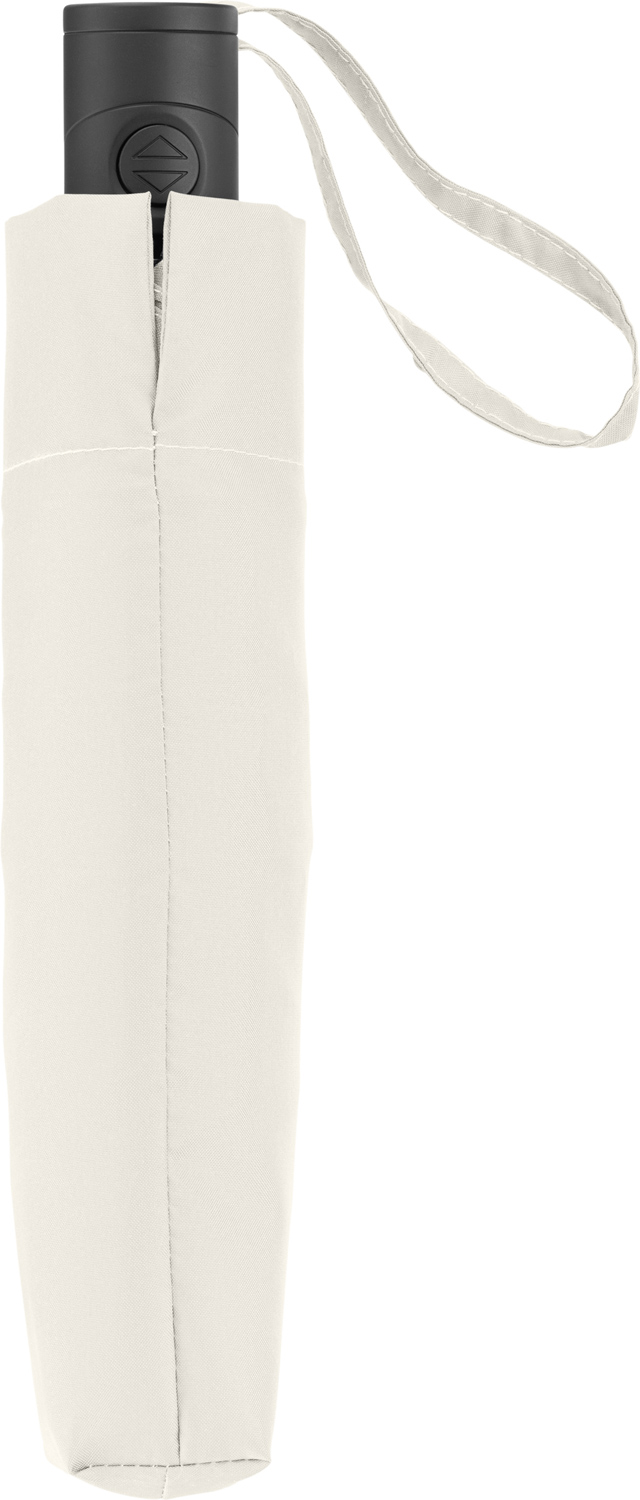 Filigraner Doppelautomatik-Taschenschirm in superleichter Ausführung. Komfortable Automatik-Funktion zum schnellen Öffnen und Schließen, hochwertiges Windproof-PLUS-System für eine maximale Gestell-Flexibilität bei stärkeren Windböen, schwarzer Aluminiumstock, wassersparend gefärbtes Polyester-Pongee waterSAVE® Bezugsmaterial aus recycelten Kunststoffen, mit waterSAVE® Label auf dem Schließband, matt-schwarzer Kunststoff-Softfeel-Griff mit Auslösetaste und Werbeanbringungsmöglichkeit, handtaschentauglich durch superleichtes Gewicht und kompakte Größe