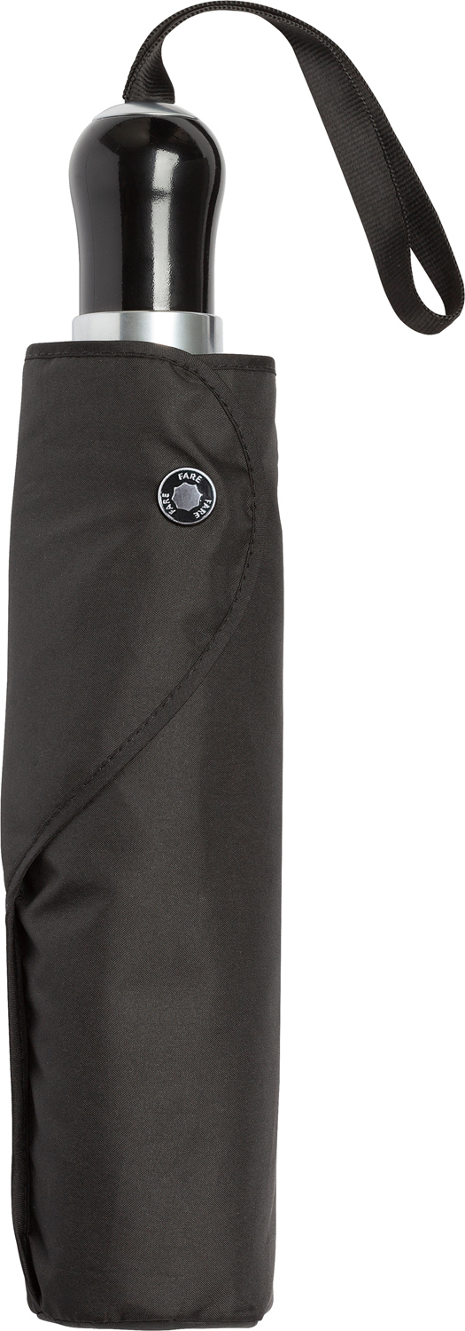 Schicker Taschenschirm mit neuartigem Öffnungs- und Schließmechanismus. Komfortable Doppelautomatik-Funktion zum schnellen Öffnen und Schließen durch Herunterziehen des Rings, hochwertiges Windproof-System für eine maximale Gestell-Flexibilität bei stärkeren Windböen, wassersparend gefärbtes Polyester-Pongee waterSAVE® Bezugsmaterial aus recycelten Kunststoffen, mit waterSAVE®-Label auf dem Schließband, silberne Nickelspitzen, Griff hochglänzend schwarz mit verchromten Applikationen und gewebter Trageschlaufe, Schließband und Futteral mit edlem Druckknopf.