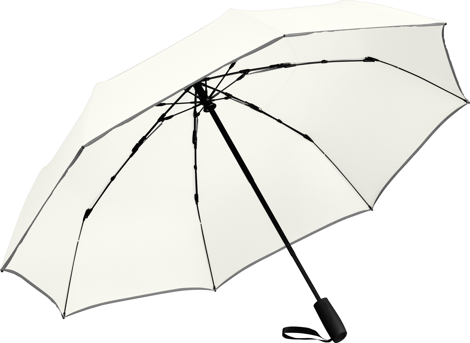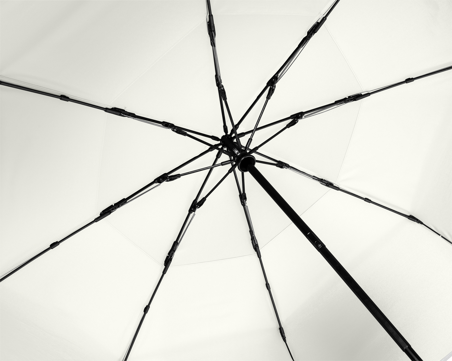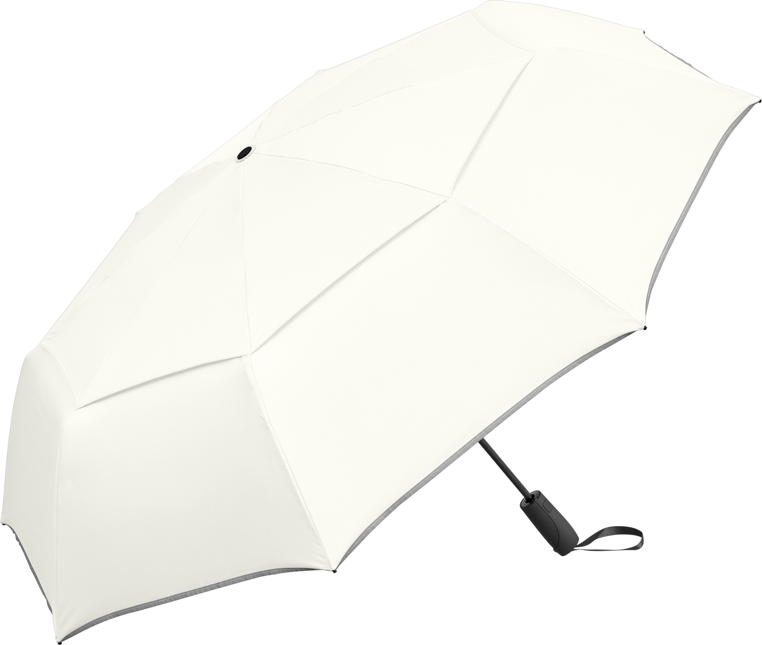 Äußerst stabiler Doppelautomatik-Taschenschirm in Übergröße. Komfortable Doppelautomatik-Funktion zum schnellen Öffnen und Schließen, hochwertiges Windproof-PLUS-System für eine maximale Gestell-Flexibilität bei stärkeren Windböen, flexible Fiberglasschienen, überlappender Ventilationsbezug zur Regulierung von Überdruck durch stärkere Windböen, wassersparend gefärbtes Polyester-Pongee waterSAVE® Bezugsmaterial aus recycelten Kunststoffen und mit modischer Reflexpaspel in Silber, mit waterSAVE®-Label auf dem Schließband, Griff aus recyceltem ABS mit integrierter Auslösetaste und Werbeanbringungsmöglichkeit, komfortables Futteral mit hochwertigem Zipper