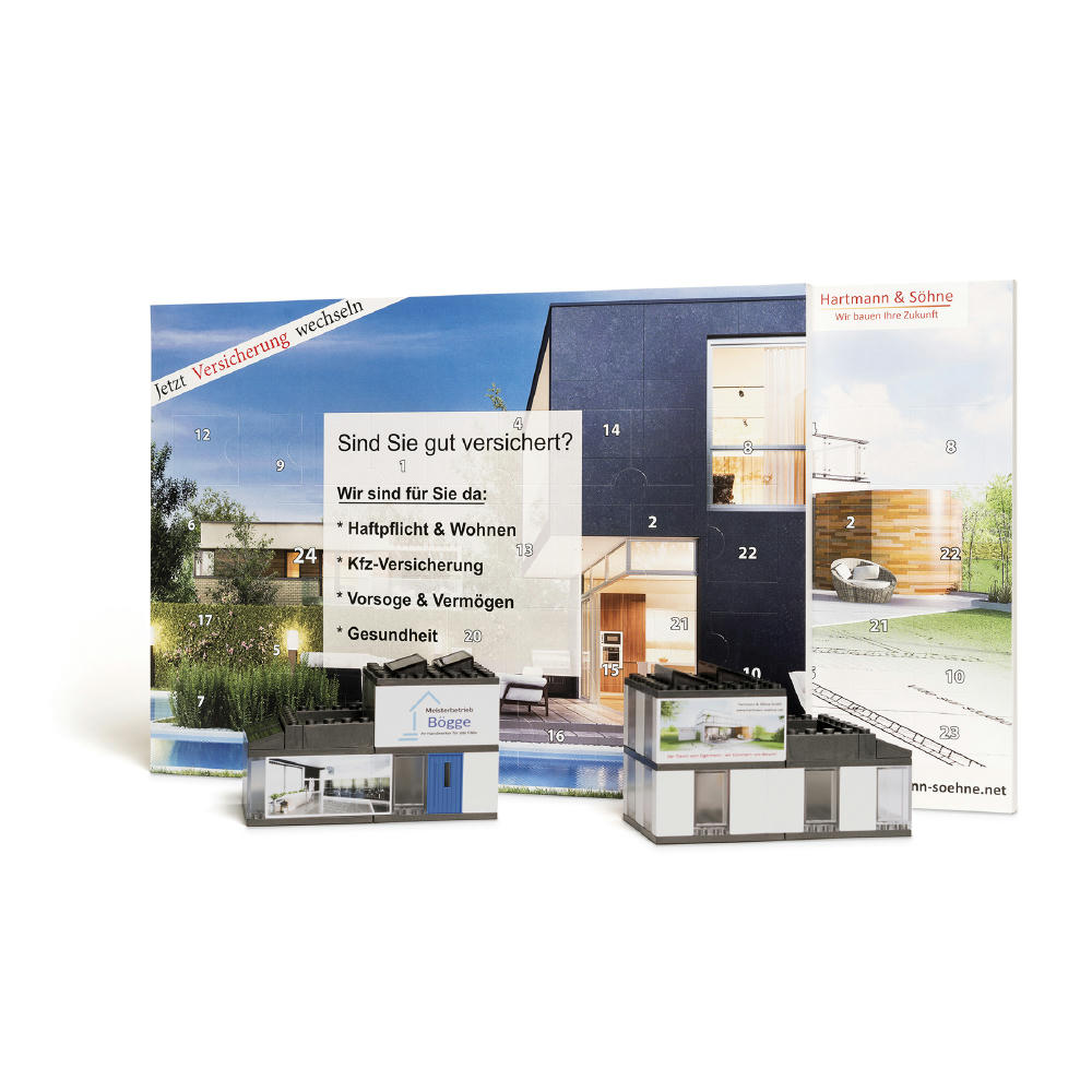 Ein Adventskalender-Bausatz bestehend aus 43 Teilen. Made in Germany. Hinter jedem der 24 Fenster befinden sich Teile, die Stück für Stück ein modernes HAUS entstehen lassen. Preis inkl. 4c-Druck auf der Adventskalendervorderseite (optional Druck auf HAUS-Fassadenwänden gegen Aufpreis).