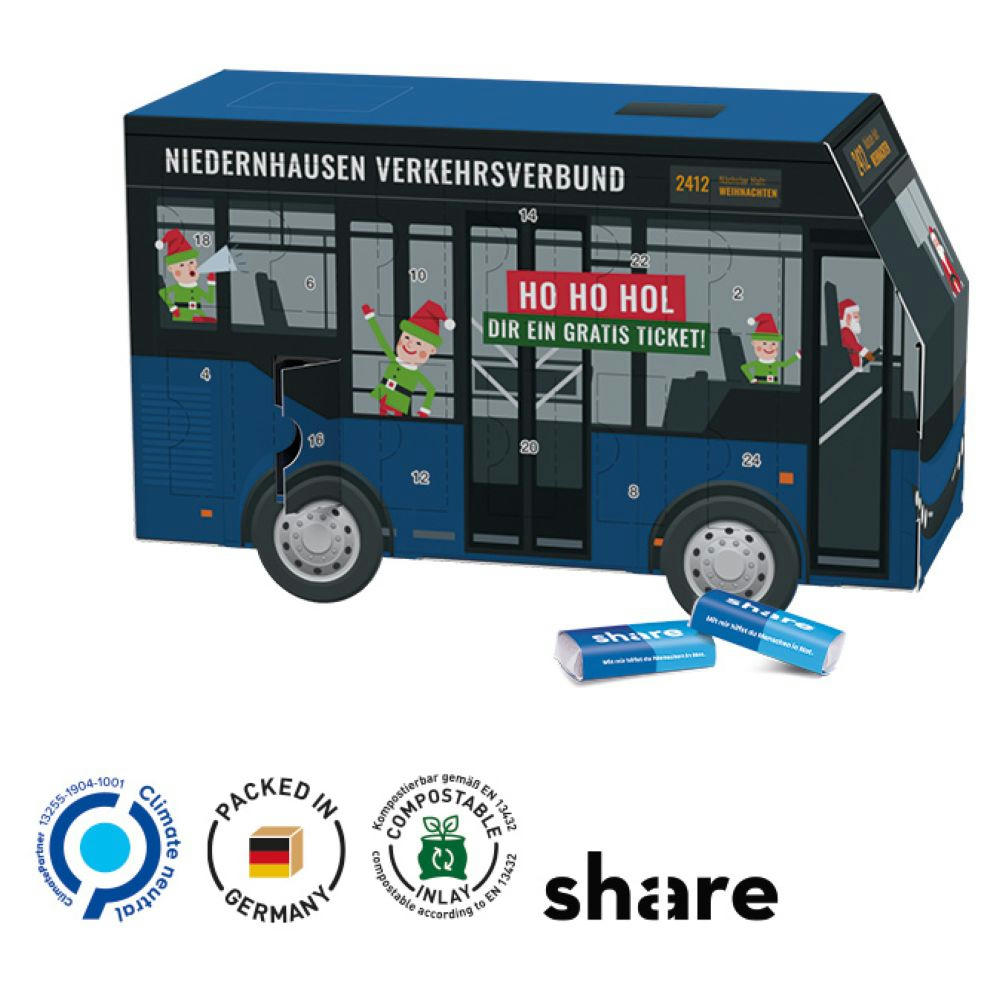 Adventskalender Bus in Vollkartonhülle mit kompostierbarem Inlay, rundum individuell bedruckt. Inhalt: 24 Ritter SPORT Schokowürfel, variierende Mischung aus den Sorten : Schoko Crisp, Mousse au Chocolat, Vollnuss in Nugatcreme, Karamell Duo, 192 g.
