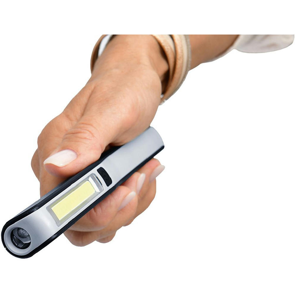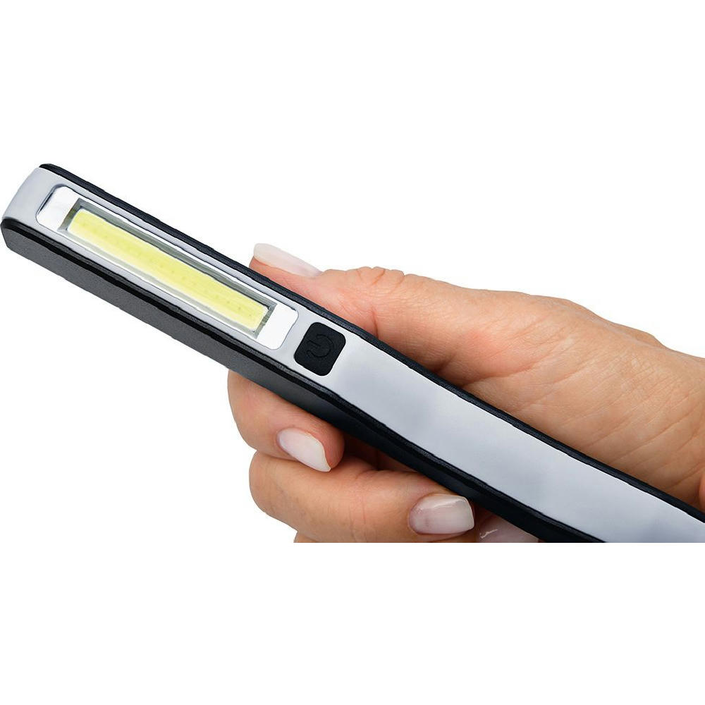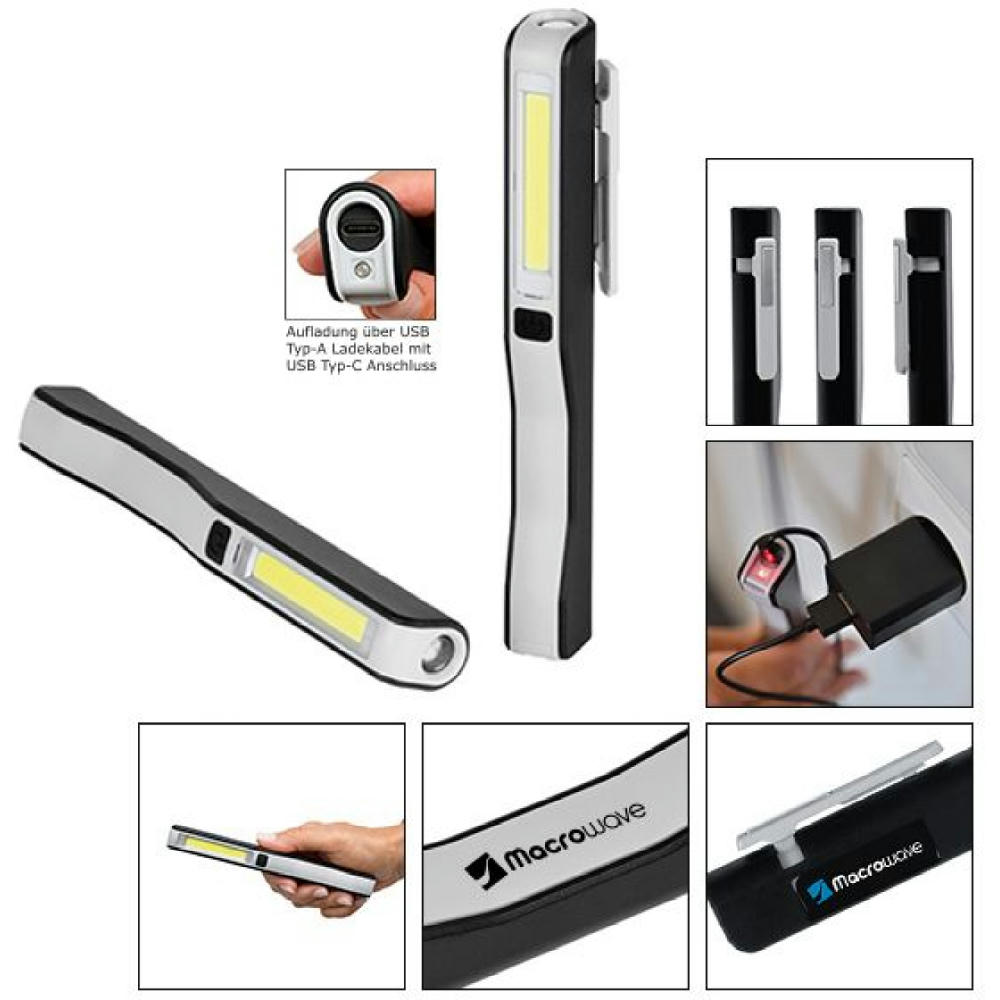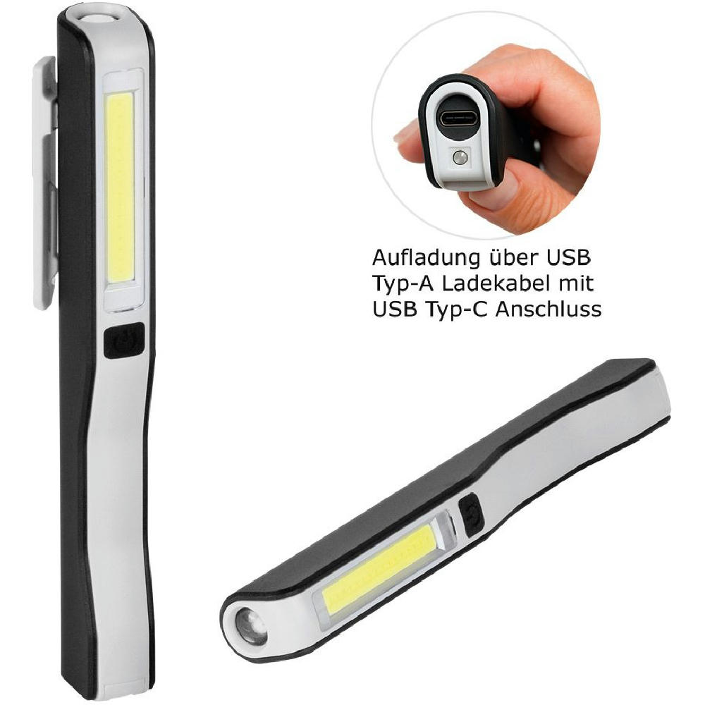 Aufladbare Leuchte mit um 90° drehbarem Clip mit starkem Magnet auf der Rückseite, mit dem die Leuchte an magnetischen Oberflächen fixiert werden kann. Leuchtmittel: Arbeitsleuchte 3W COB LED, Taschenleuchte 1W SMD LED. Lichtwerte: Arbeitsleuchte 130 Lumen, Taschenleuchte 40 Lumen. Ladezeit: ca. 2,5 Std. (mit Ladestandsanzeige). Inkl. USB / Micro-USB Ladekabel (50 cm Länge), 800mAh Lithium-Akku Typ 14500.