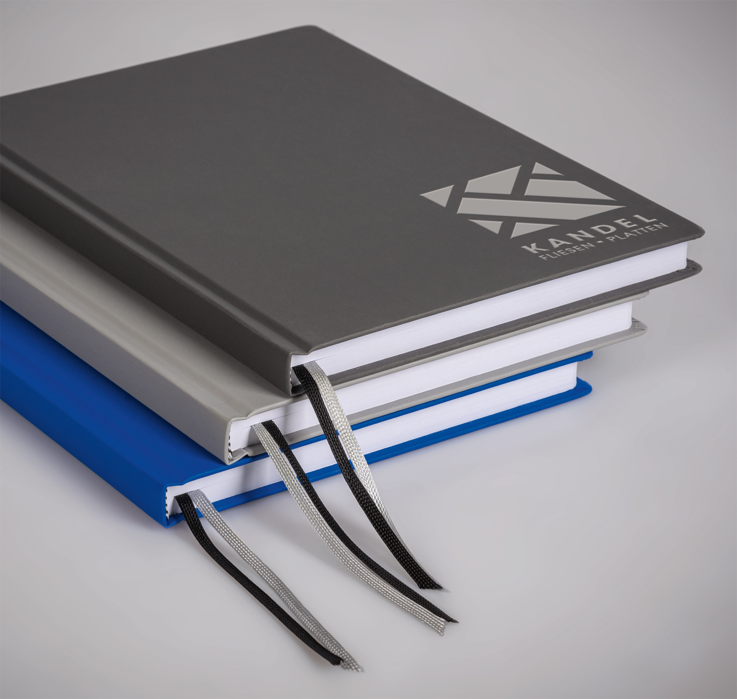 Notizbuch mit Einband aus Bucheinbandstoff in 3 Farben, 192 Seiten karierter Inhalt mit Umrandung und Kopfzeile und Perforation, Kapitalband, zwei Zeichenbänder, runde Ecken bei Inhalt und Einband.