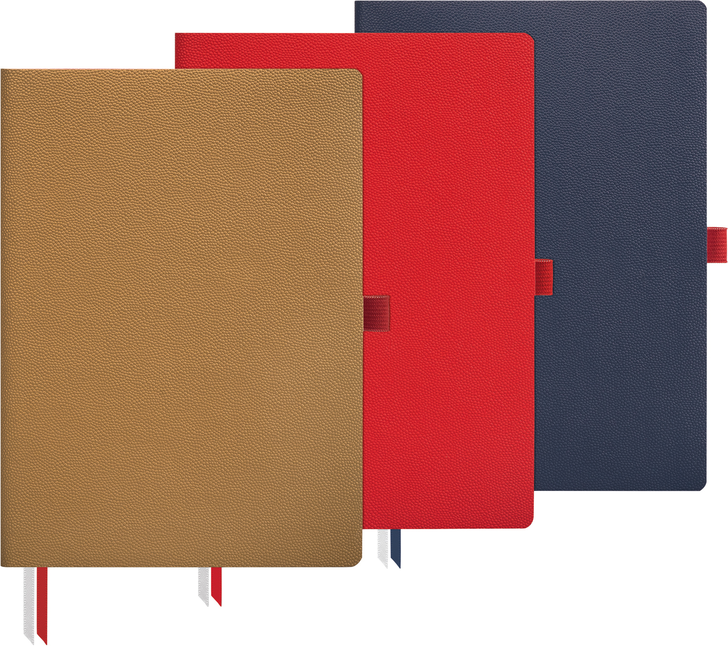 Notizbuch mit flexiblem Softeinband als Duodecke in 3 Farben, 192 Seiten Inhalt punktiert mit Perforation, Kapitalband, zwei Zeichenbänder, rote Stiftschlaufe, runde Ecken bei Inhalt und Einband.