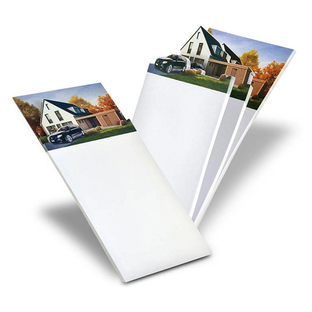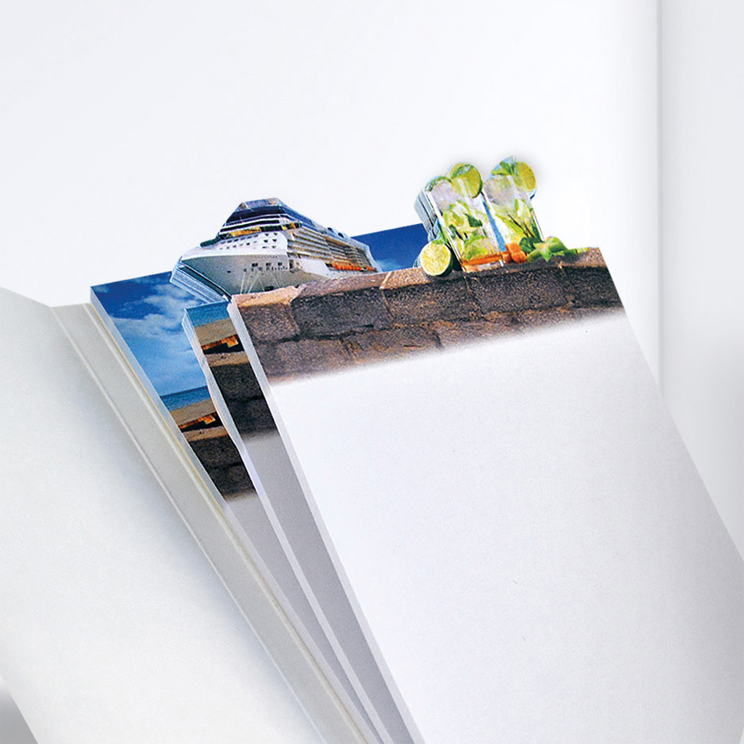 Durch die Formstanzung des mittleren und des obersten Blocks und das perfekt aufeinander abgestimmte Druckmotiv ergibt sich ein beeindruckender 3D-Effekt. Material Block: Offsetpapier 90 g / m2 matt, holzfrei, weiß. Material Bodenblatt: 300 g / m2 Offsetkarton, weiß. Farbe: projektabhängig. Maße: 8,5 x 16 cm à ca. 60 Blatt. Das Trio-Pad ist auch mit Kartonumschlag erhältlich. Preis ab 500 St. inkl. 4c-Druck.