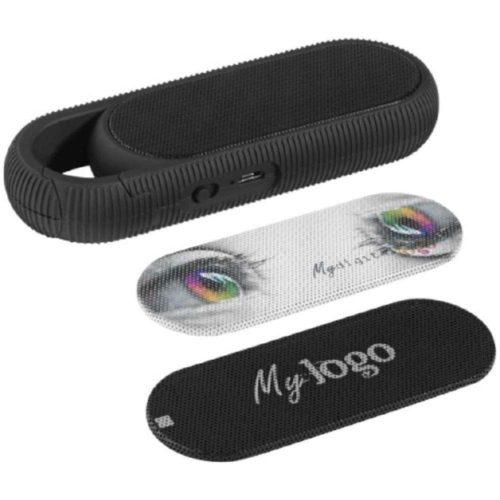 Kompakter wireless Lautsprecher mit großem Sound und Karabiner. 3W, 300mAh Lithium-Ionen-Akku, für 3-5 h Musik / 4-6h Ladezeit. USB-Kabel.