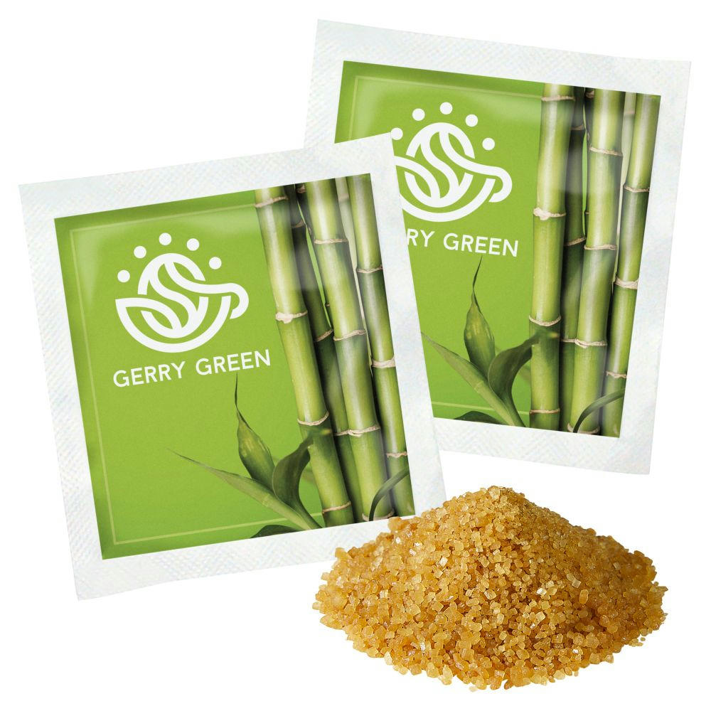 Brauner Rohrzucker in weißem Papiertütchen verpackt. Haltbarkeit:unbegrenzt bei sachgerechter Lagerung. Preis inkl. 1-4c Druck.