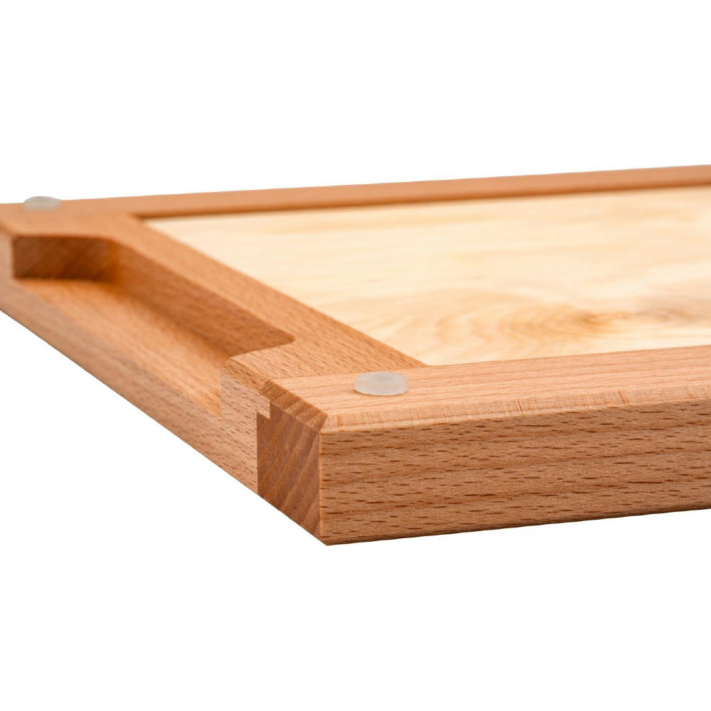 Brotschneidebrett aus geöltem Buchenholz mit herausnehmbarem Krümelgitter und Gummifüßen als Schutz gegen Verrutschen.