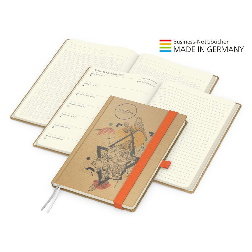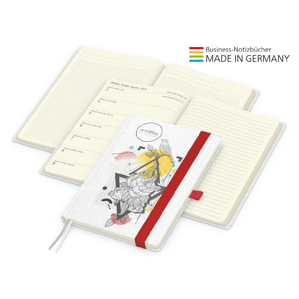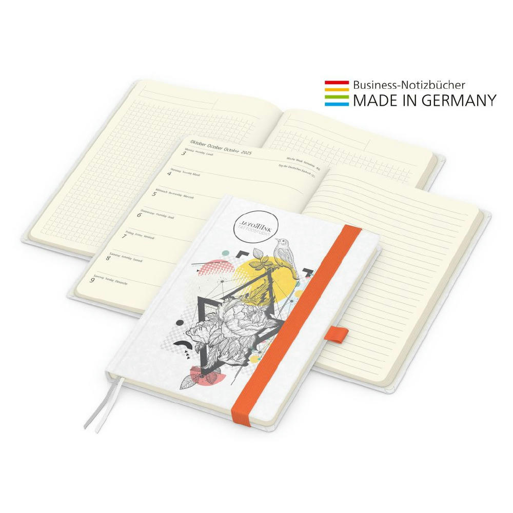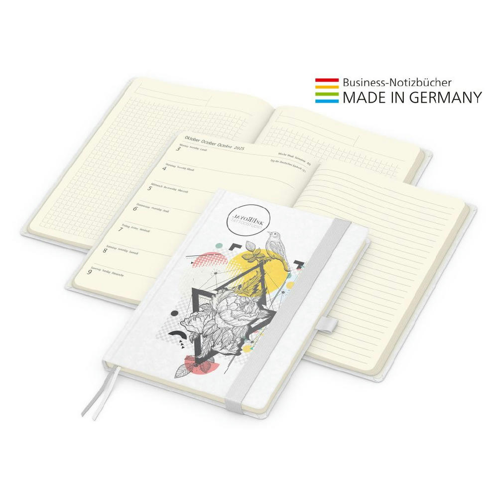 Der Hybrid-Timer für jedes Corporate Design mit cremefarbenem Inhaltspapier. Individuell bedruckter Einband kombiniert mit Gummiband und Stiftschlaufe in Wunschfarbe. Wochenkalendarium von August 2024 - Dezember 2025