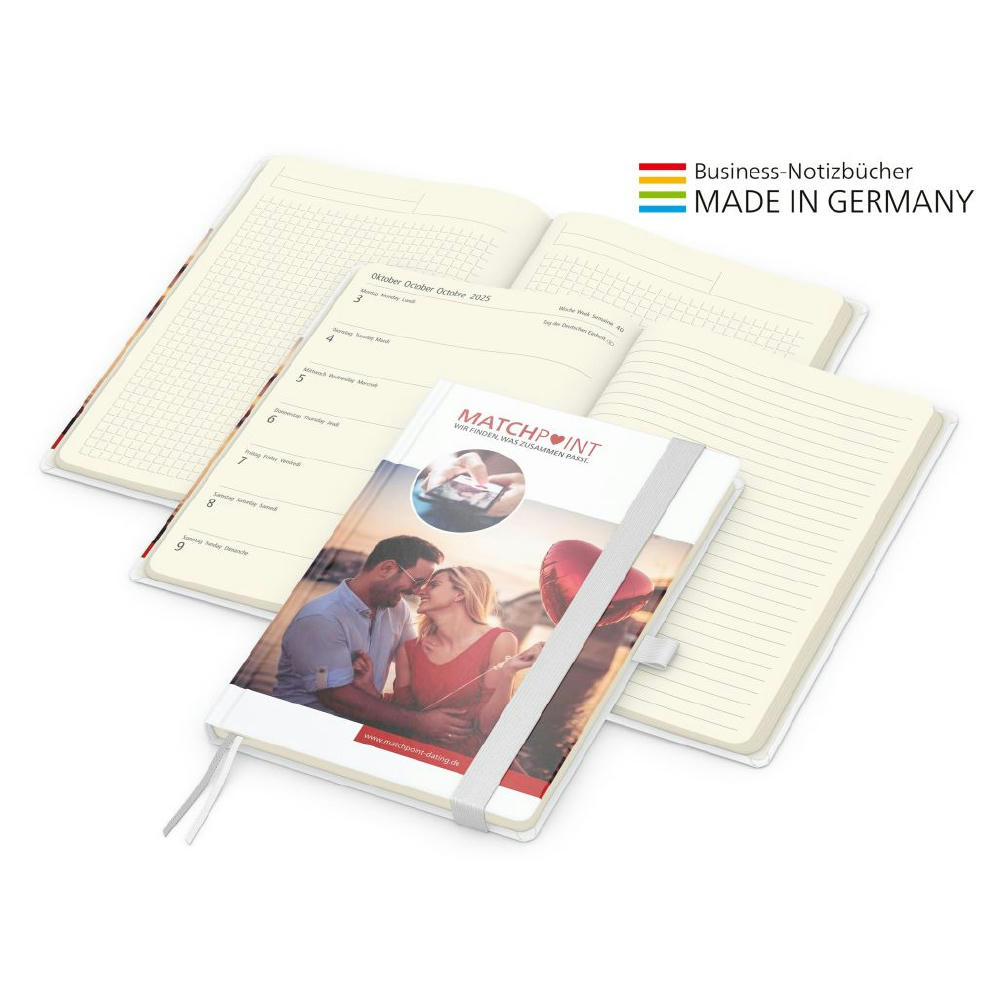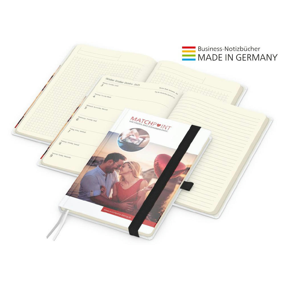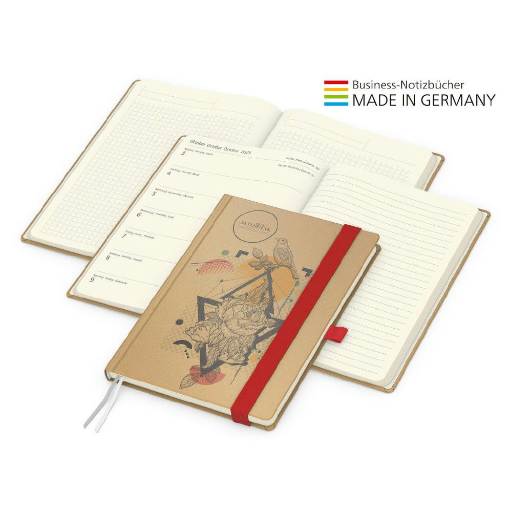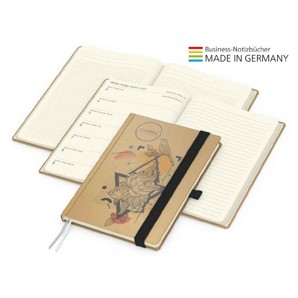 Der Hybrid-Timer für jedes Corporate Design mit cremefarbenem Inhaltspapier. Individuell bedruckter Einband kombiniert mit Gummiband und Stiftschlaufe in Wunschfarbe. Wochenkalendarium von August 2024 - Dezember 2025