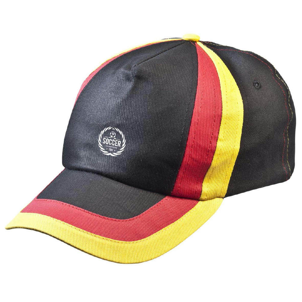 Sportlich und schick zugleich. Hochwertiges Cap aus Baumwolle in schwarz mit zwei geschwungenen Streifen in rot und gelb. Größenverstellbar mittels Klettverschluss hinten. Sportlicher Schnitt.