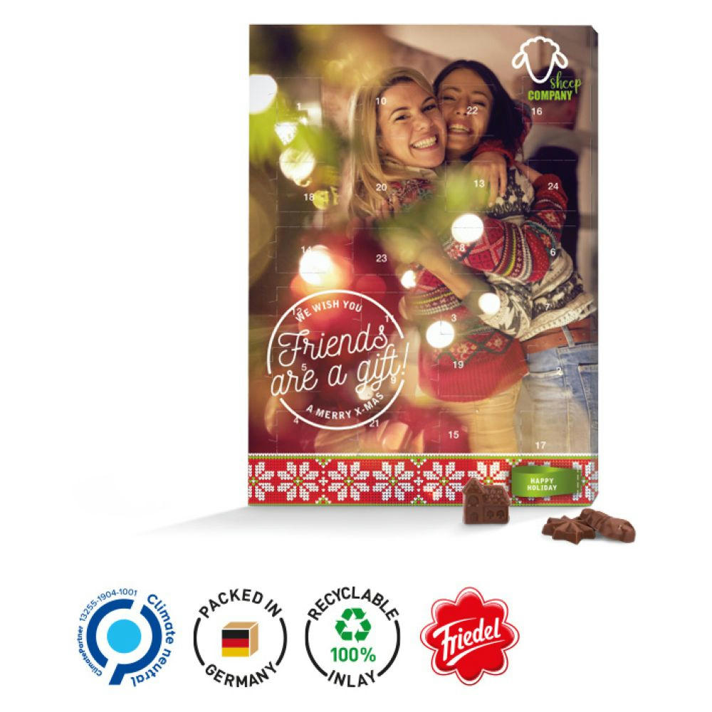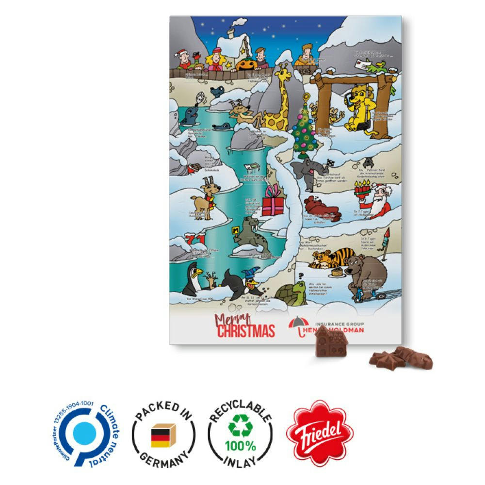 Rätsel Adventskalender in Vollkartonhülle, Querformat, recycelbar, mit Rätselmotiv "Weihnachtsdinner". Im unteren Teil des Kalenders ist Platz (Ca. 345 x 25 mm mm) für dein Logo und deinen individuellen Weihnachtsgruß. Ein Teil des Ertrags dieses Kalenders unterstützt die Albert Schweitzer Kinderdörfer und Familienwerke. Inhalt: 24 Friedel Vollmilch Schokoladentäfelchen, 70 g.