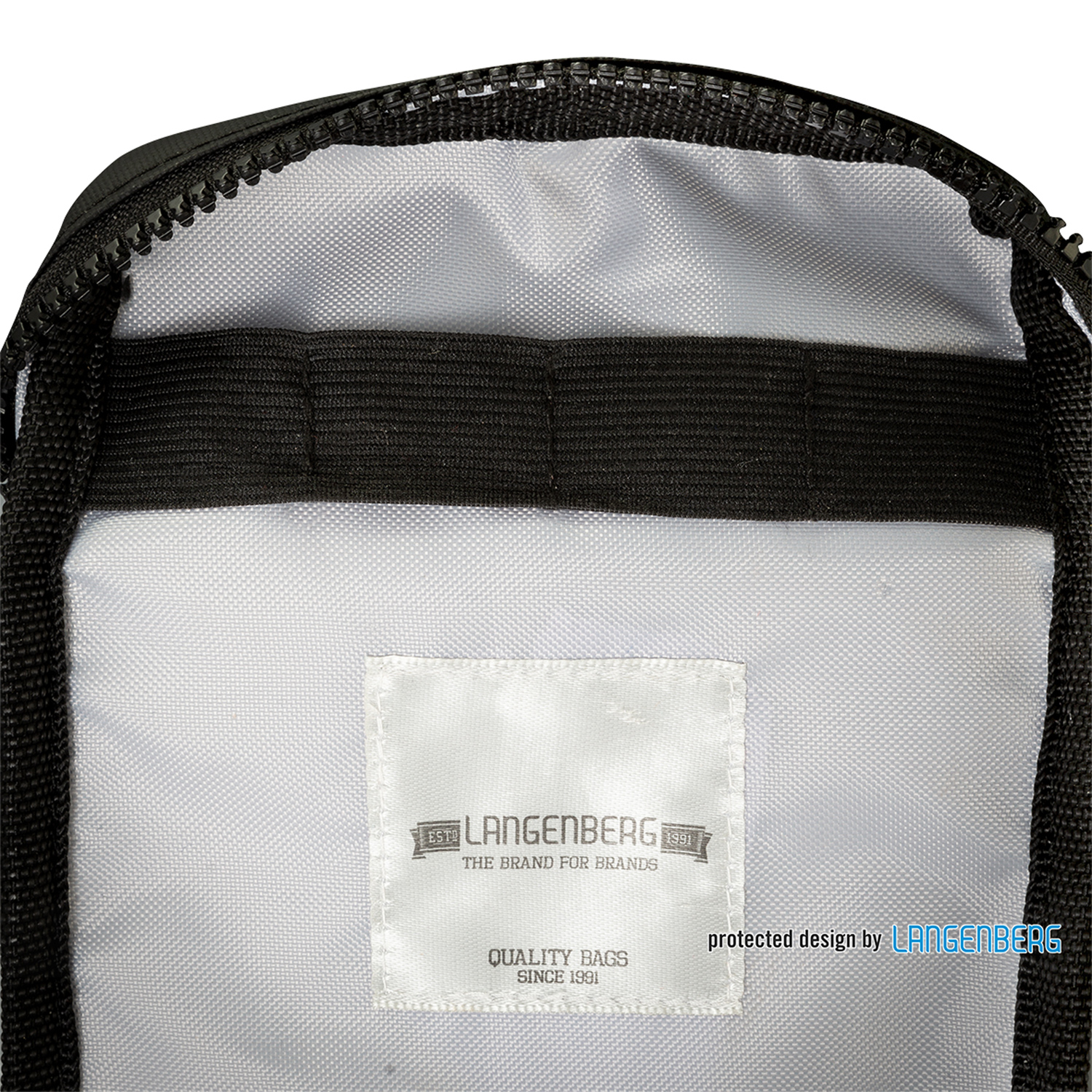 Reißverschlusshauptfach innen mit Einsteckfach sowie 4 elastische Schlaufen, Reißverschlussvortasche mit kleinem Kunststoffkarabiner, abnehmbarer Tragegurt, Volumen ca. 2l