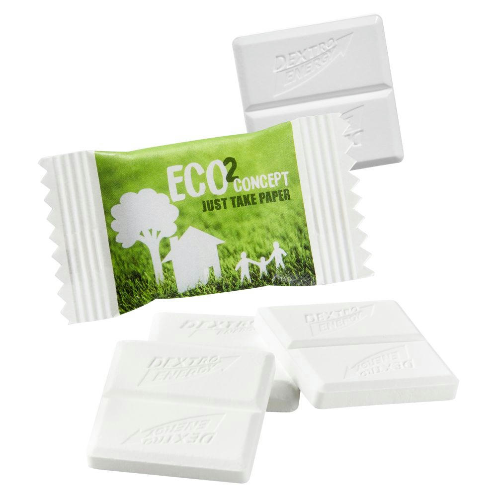 DEXTRO ENERGY* Traubenzucker im Papierflowpack verpackt. Werbeflowpack recyclebar im Papierkreislauf. Haltbarkeit: ca. 9 Monate. Inkl. 1-4c-Druck.