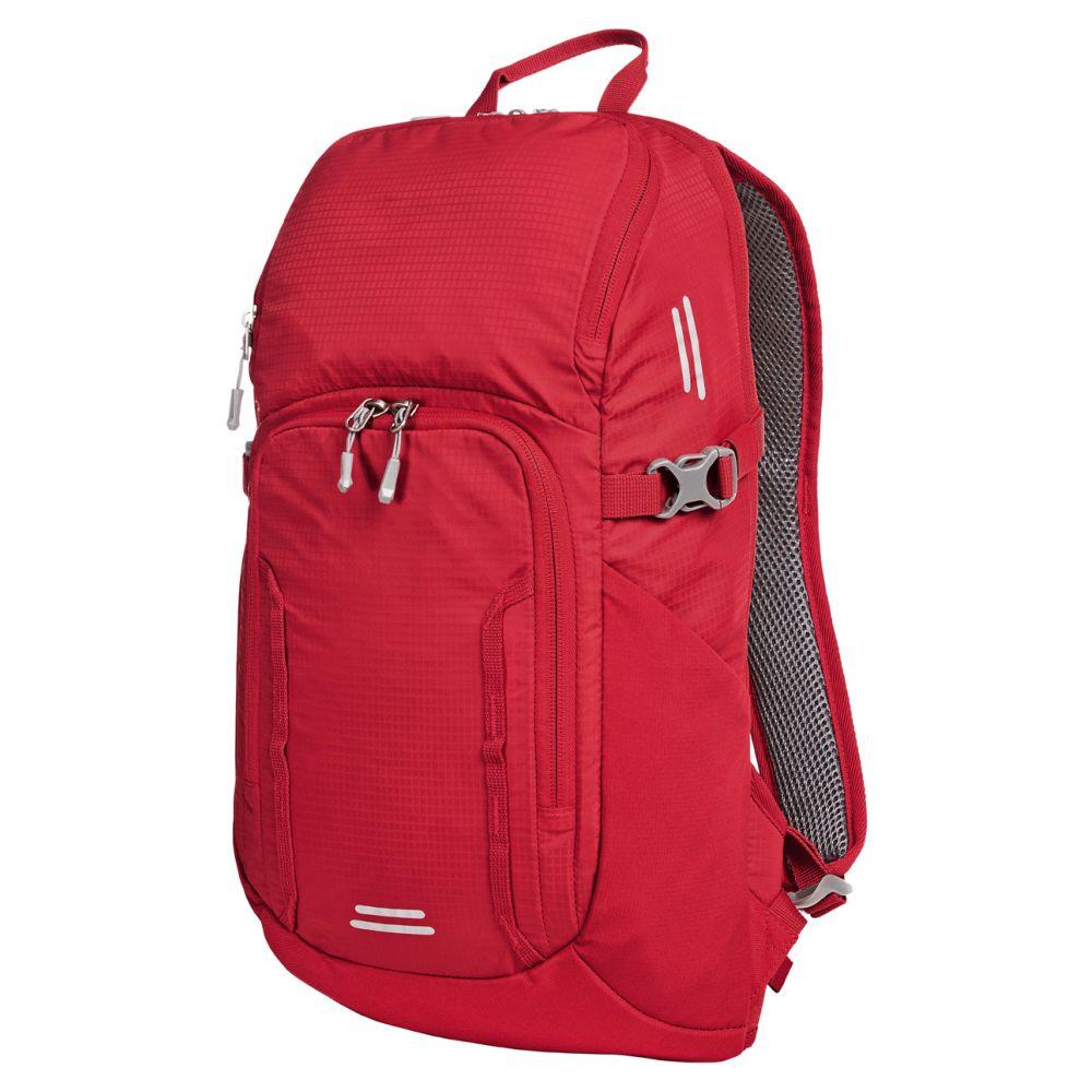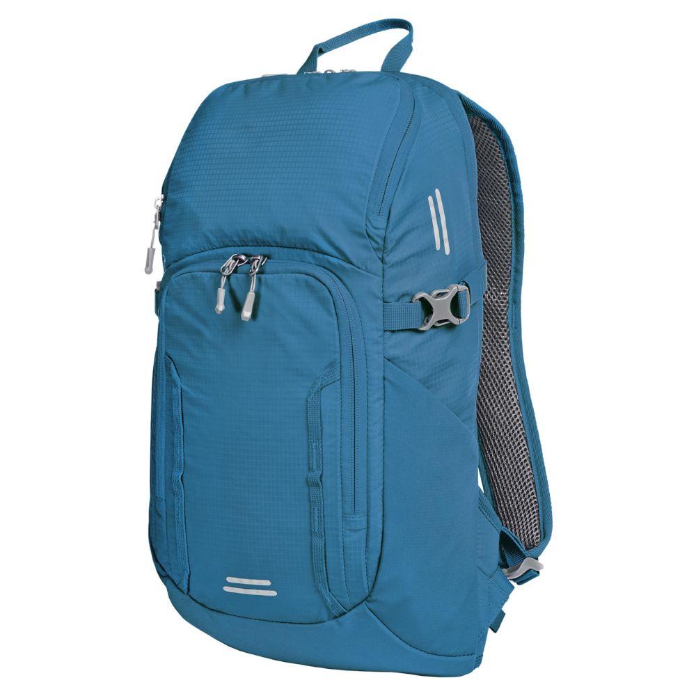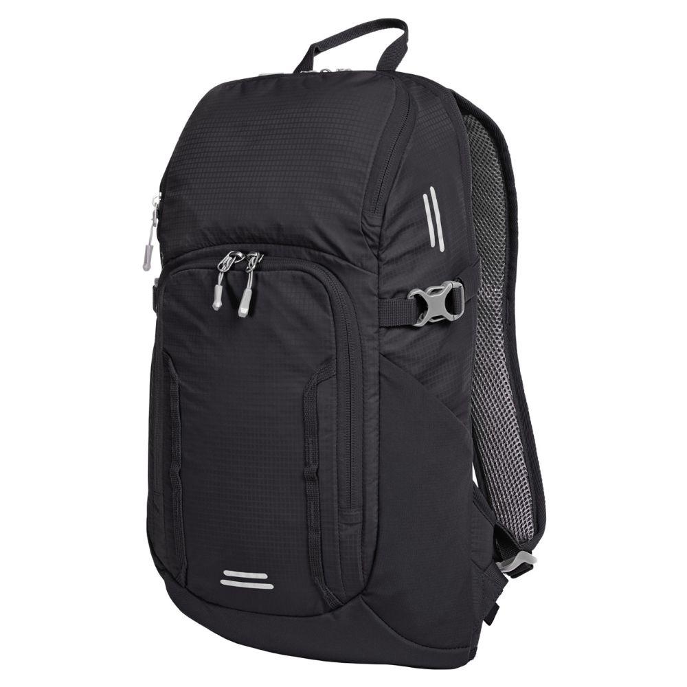leichter, funktioneller Tages- und Bike-Rucksack mit innovativem Waben-Rückensystem für ideale Belüftung und Polsterung; höhenverstellbarer Brustgurt; seitlich gepolsterter Beckengurt; großes 2-Wege-Reißverschluss-Hauptfach mit flachem Einsteckfach innen; rückseitiger Ausgang geeignet für z.B. Kopfhörer oder Schlauch des zusätzlich lieferbarem Trinksystems (Artikel 1812216); Klettloop zur Fixierung des Trinkschlauches; 2 Reißverschlussvortaschen; 2 Netz-Seitentaschen; seitliche Zurrgurte; funktionales Schlaufenband auf der Fronttasche; dekorativer Reflex-Aufdruck, Handgriff