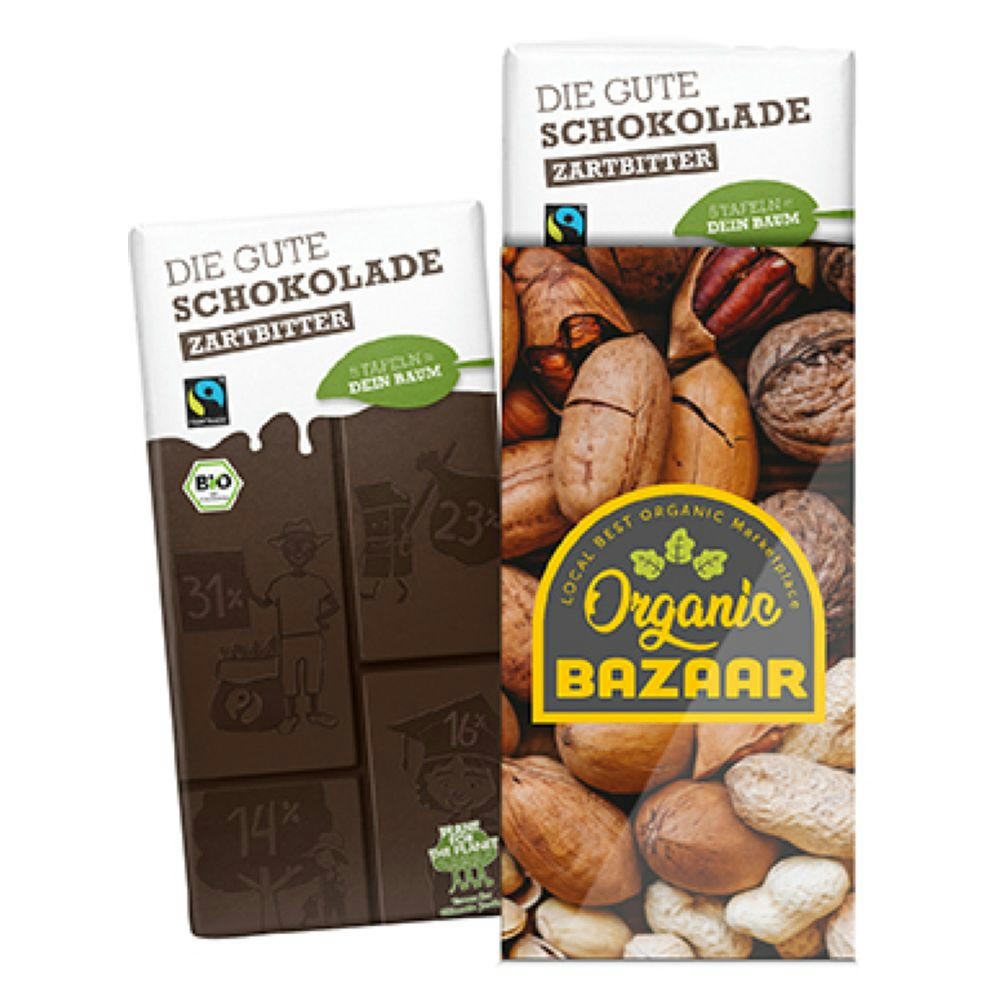 Stück für Stück Gutes tun mit der Guten Schokolade von Plant-for-the-Planet. Ein Teil der Erlöse kommt der Arbeit der Kinder- und Jugendinitiative Plant-for-the-Planet zu Gute, die pro 5 verkaufter Tafeln einen Baum pflanzt. Leckere Schweizer Vollmilch Schokolade mit individuellem Werbedruck auf Kartonschuber. Auf Wunsch mit digitaler Baumspendenurkunde. Variante : Die Gute Schokolade | 100 g | Vollmilch | Kartonage | 4c Euroskala