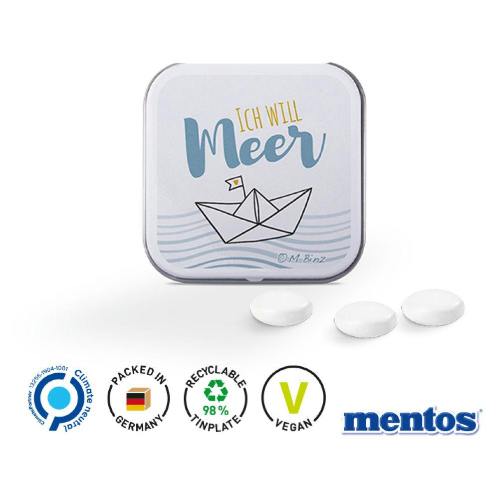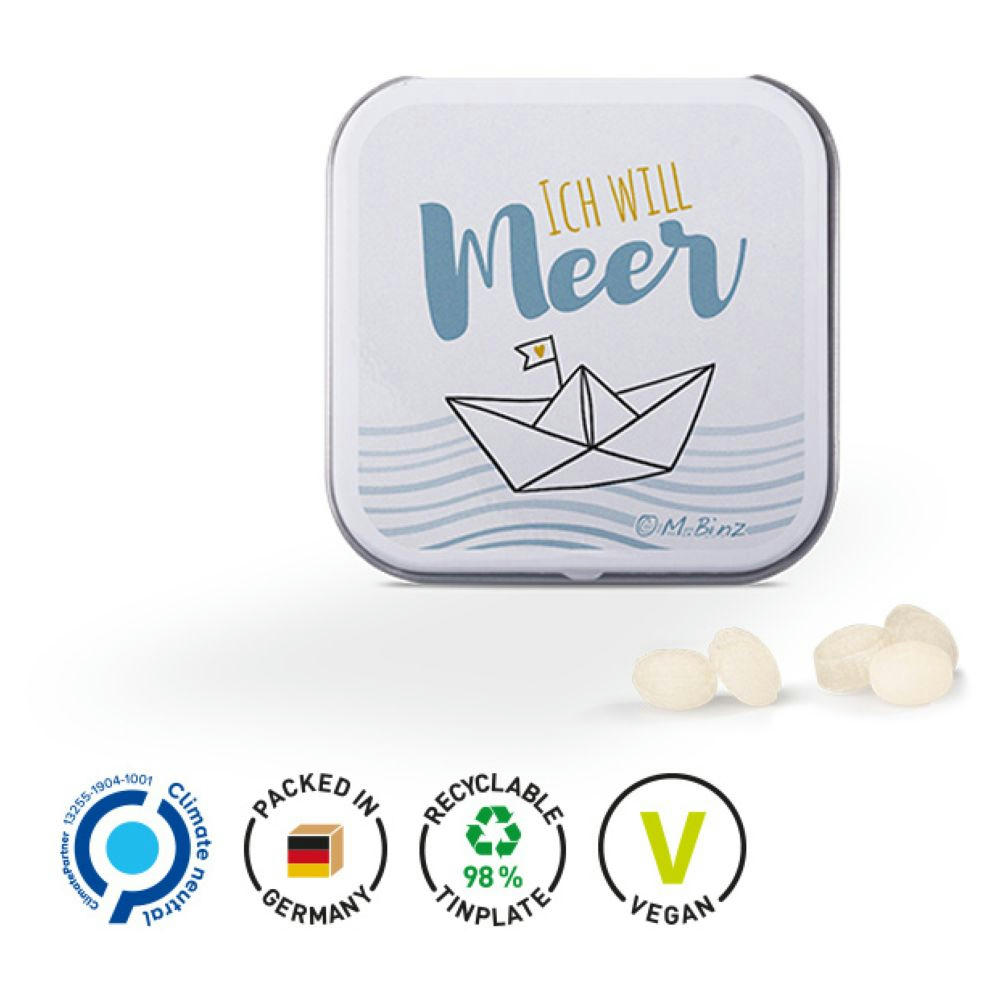 Quadratische weiße Metalldose mit Scharnierdeckel, Weißblech 98% recycelbar, individuell bedruckt. Inhalt: Cavendish & Harvey Mini Bonbons Japanisch Minze, 20 g.