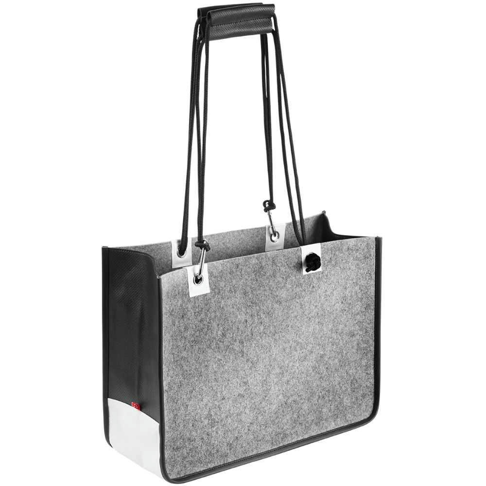 Schicke Shopping Tasche im interessantem Materialmix aus Filz, LKW Plane und PU, offenes Hauptfach, Metallöse für Handschlaufen in Tarpaulin eingefasst, Tragegriffe aus rundgewebtem Polyester, Handgriffe in edlem PU in Loch Optik. Innentasche abnehmbar aus 300D Nylon. Volumen: 22,5 Liter.