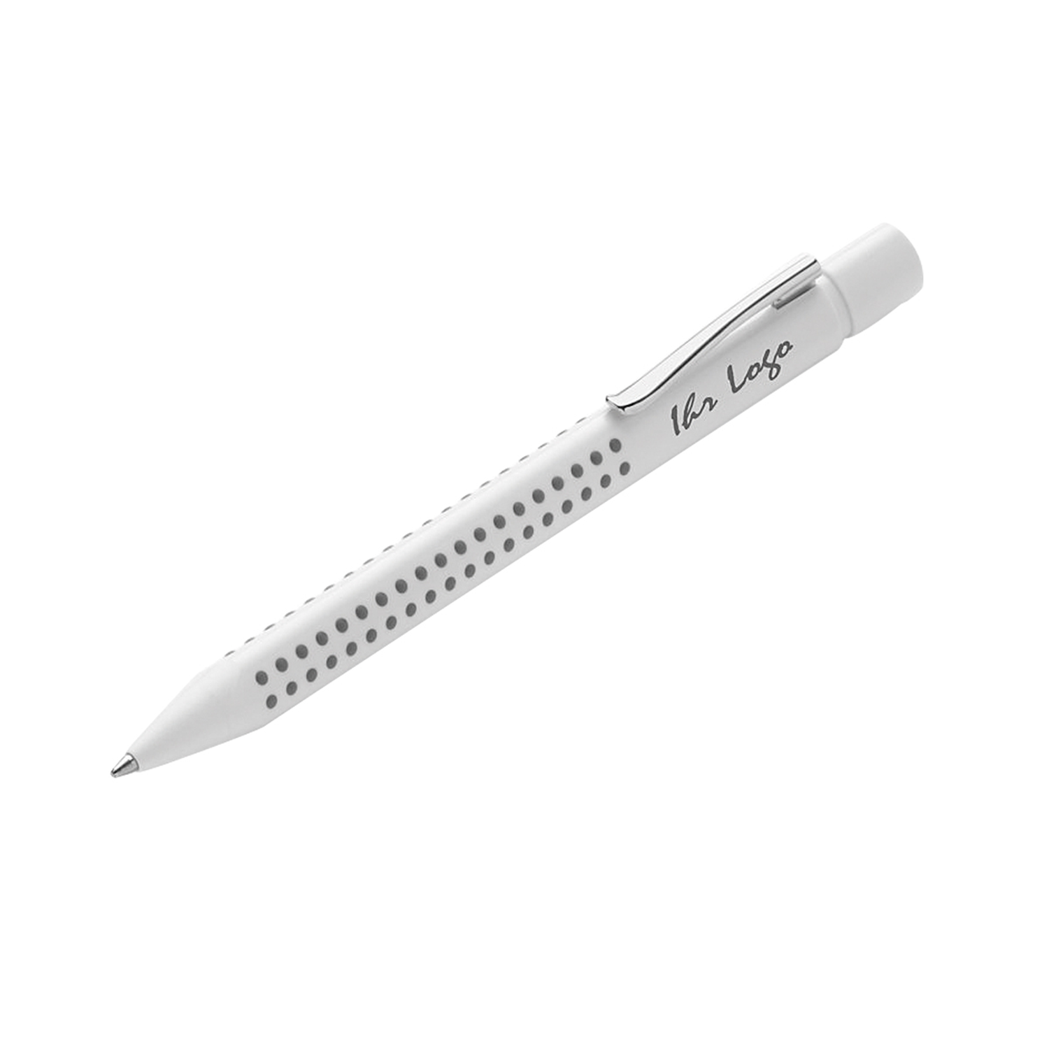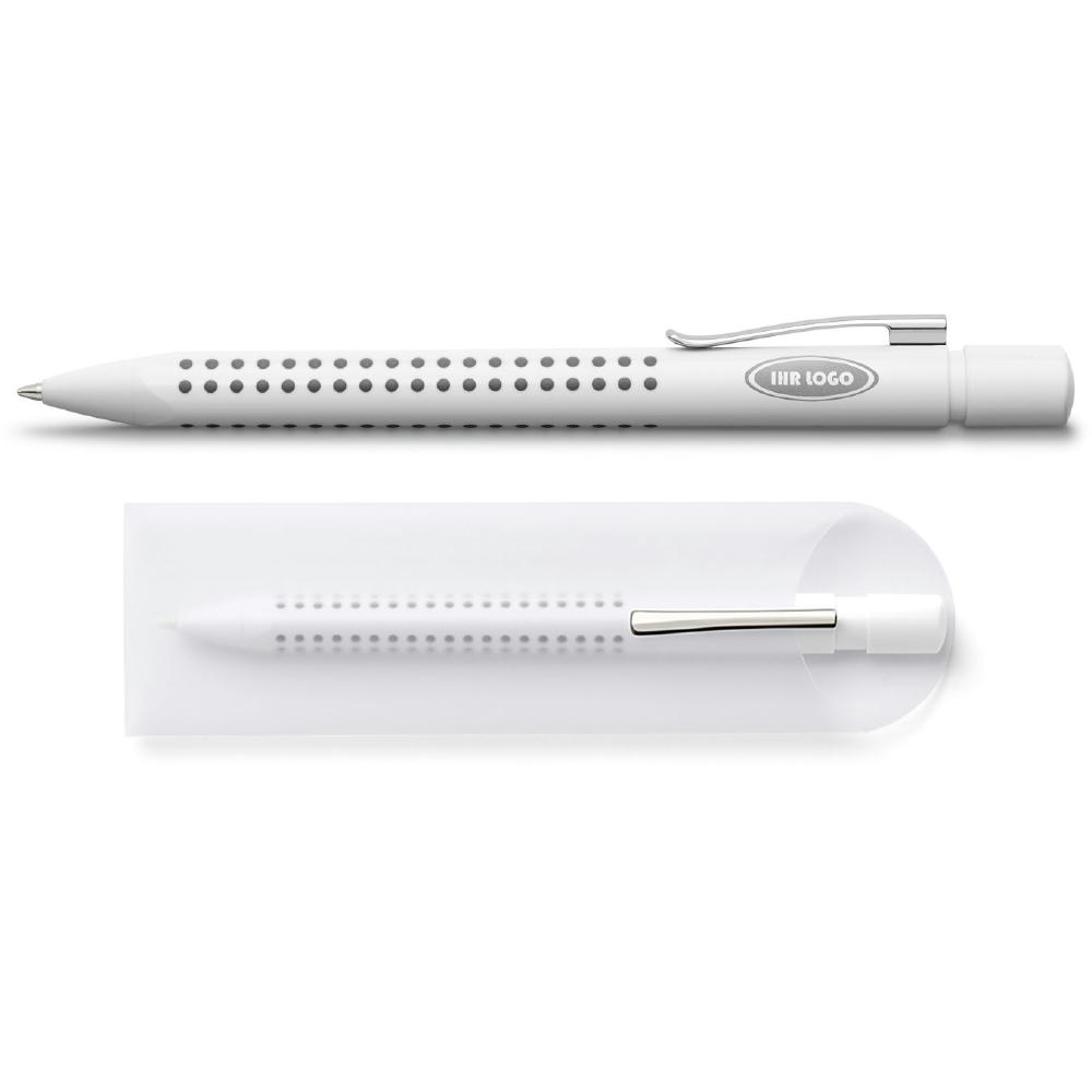 Druckkugelschreiber Grip 2010 in Weiss als erfolgreicher Teil der Grip-Familie. Schaft und Spitze aus Kunststoff, ergonomische Dreikantform mit Noppen, Metallclip mit dokumentenechter Kunststoffgrossraummine blau/M. MADE IN GERMANY. Einzeln im umweltfreundlichen Pergamin Stecketui (FSC-Material).