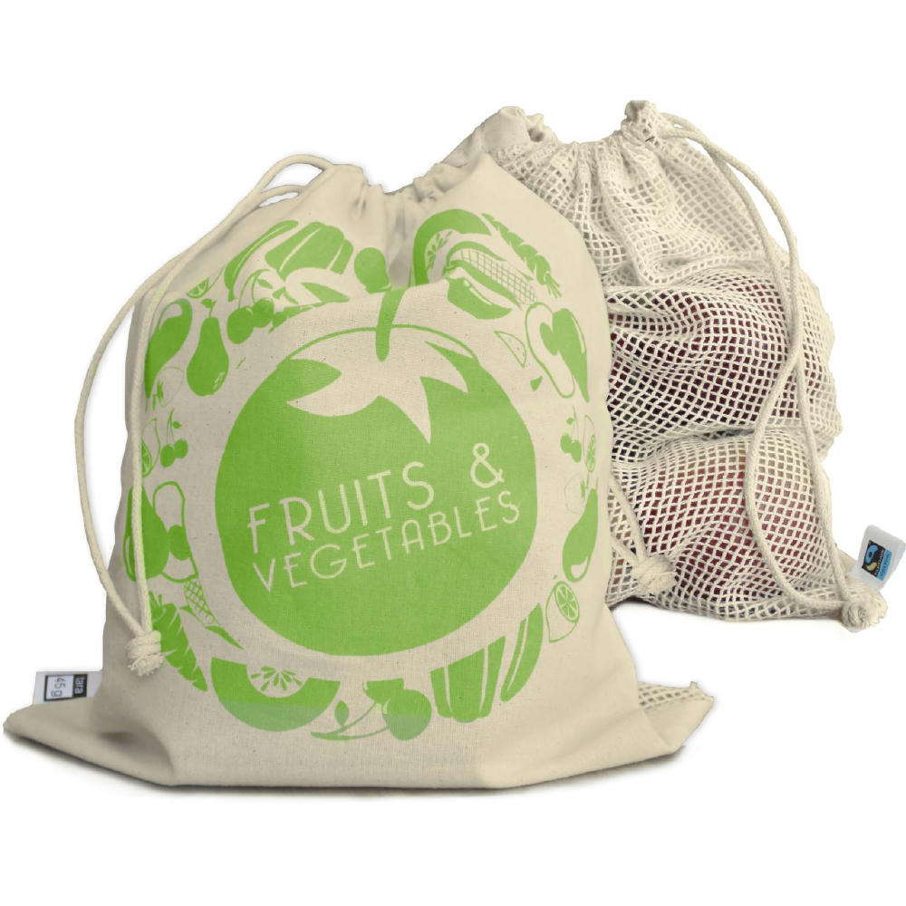 Baumwollbeutel für Obst und Gemüse. FairTrade, Öko-Tex 100, Vorderseite aus Baumwolle zum Bedrucken, Rückseite aus Baumwollnetz für Sichtbarkeit der Ware.