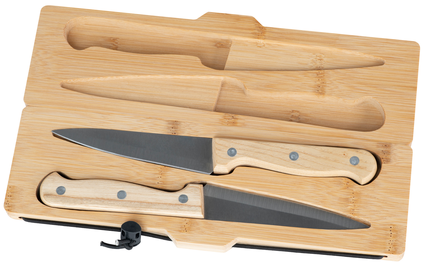 Material: naturbelassenes Bambus, Edelstahl. Maße: 29 x 9,3 x 3,1 cm (geschlossen), 29 x 18,6 x 1,55 cm (geöffnet).