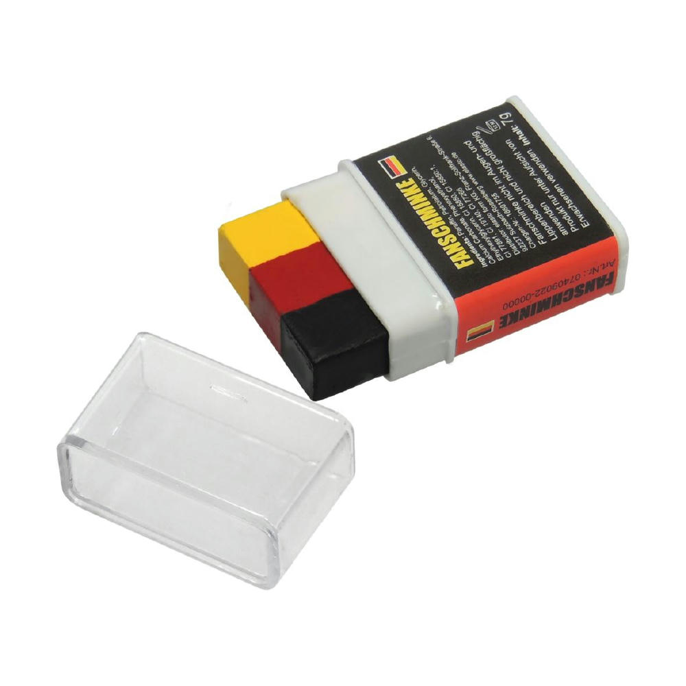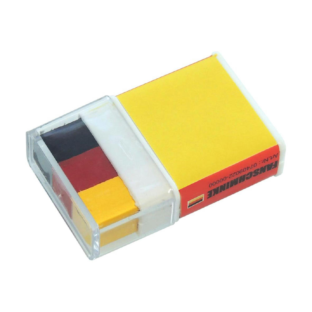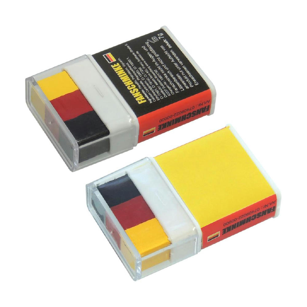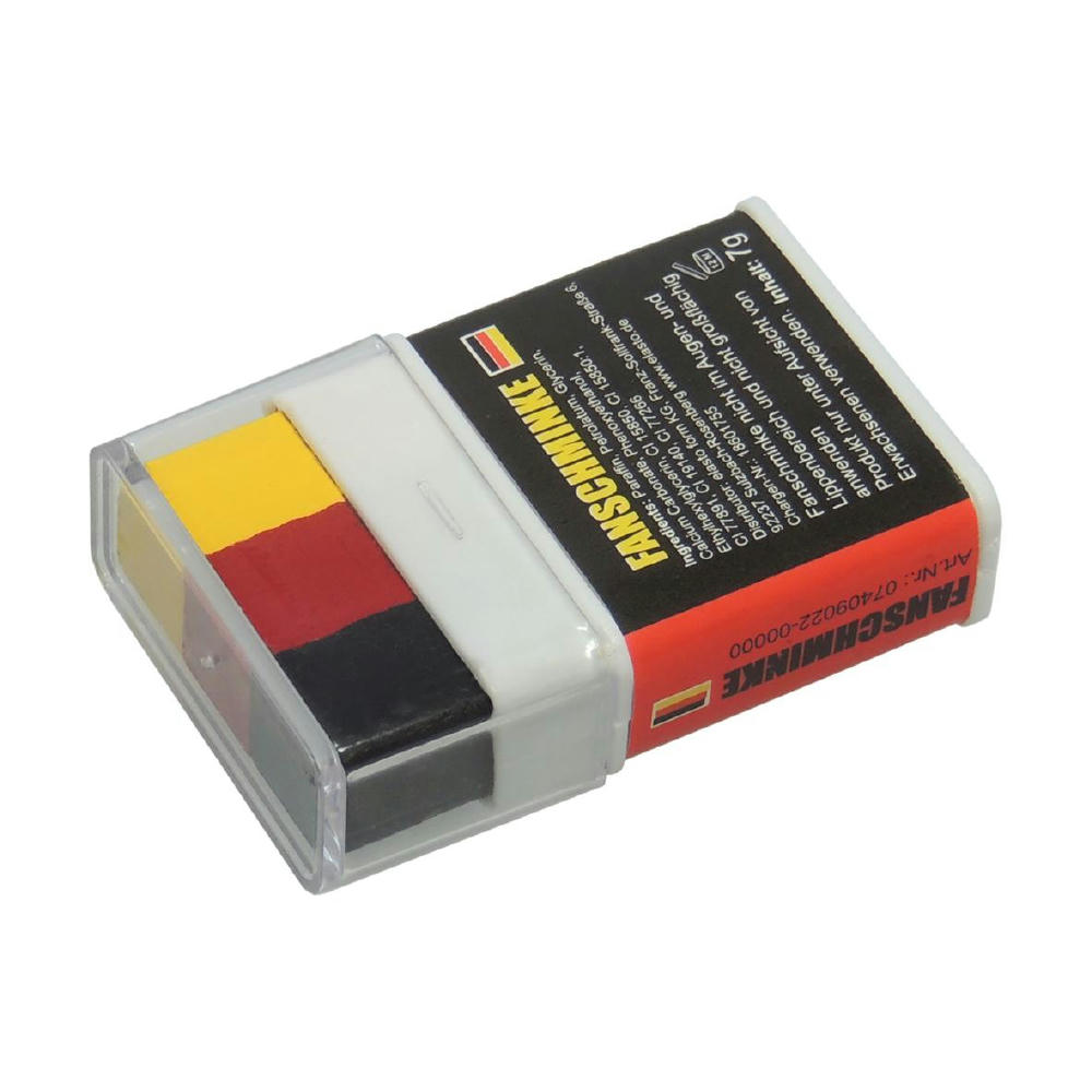 Fanschminke mit weißem Plastikhalter und transparentem Deckel. Schwarz-rot-gelbe Banderole bedruckt mit den Inhaltsstoffen. Hautverträglich und rückstandslos abwaschbar.