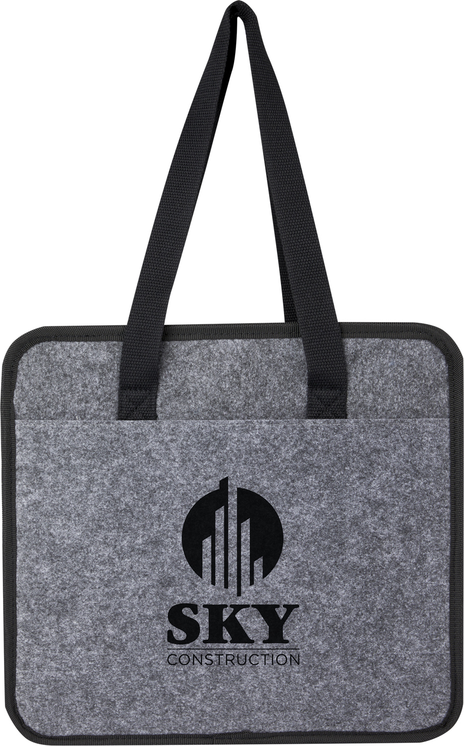 Faltbarer Kofferraum-Organizer aus weichem und strapazierfähigem GRS-zertifiziertem, recyceltem Filz. Ausgestattet mit 2 großen Fächern, verstärkten Bodenplatten, Vordertasche, Netztasche und 2 langen gewebten Baumwollgriffen (30 x 2,5 cm).