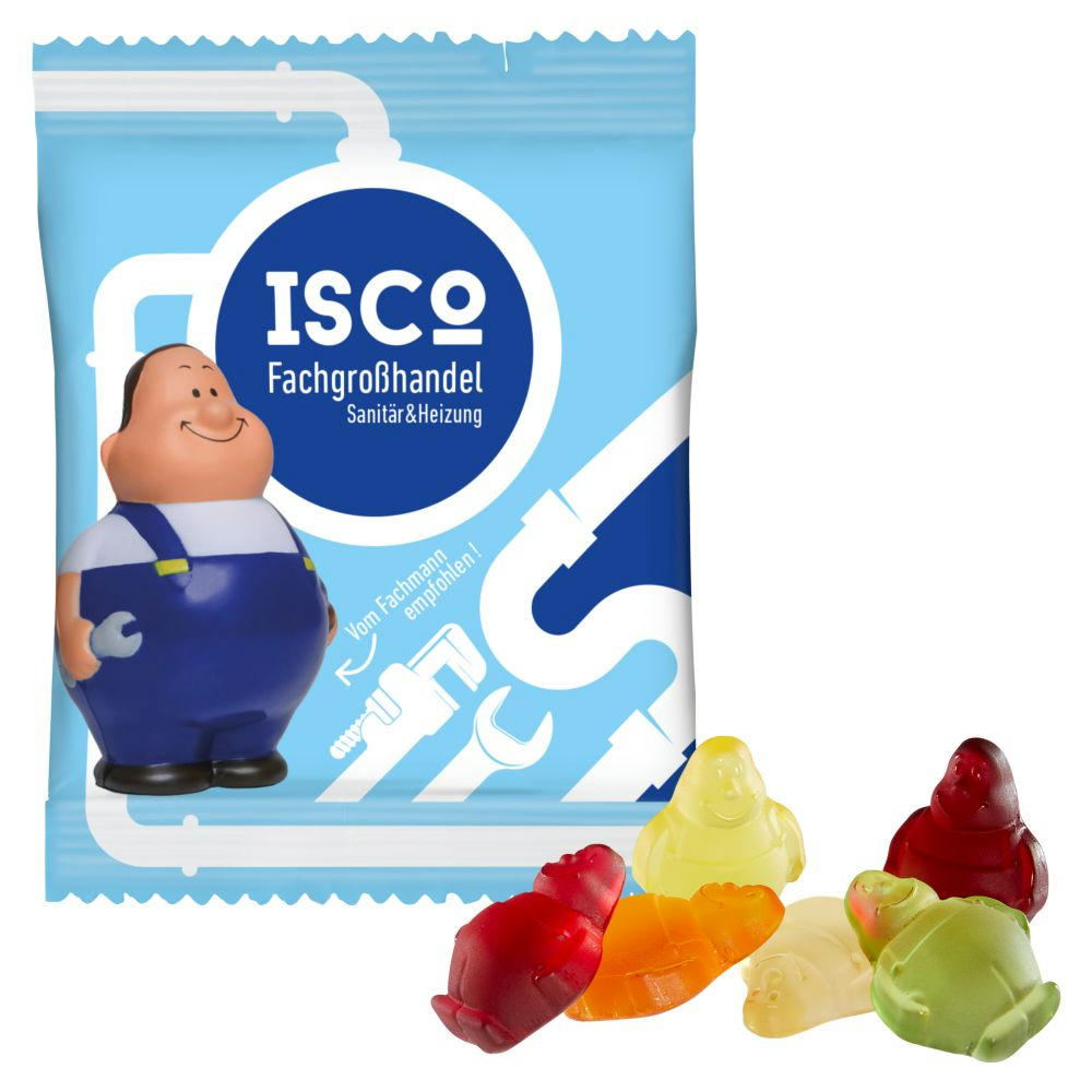 Die kultige SQUEEZIES® Figur Herr Bert® als Anti-Stress Handtrainer, jetzt endlich als Anti-Stress „Kautrainer“, farblich und geschmacklich bunt gemischt mit Orangen-, Passionsfrucht-, Zitronen-, Kirsch-, Ananas- und Himbeergeschmack, in glänzend- oder matt-kaschiertem transparentem alternativ weißem Werbetütchen verpackt. Haltbarkeit: ca. 12 Monate. Inkl. Druck.