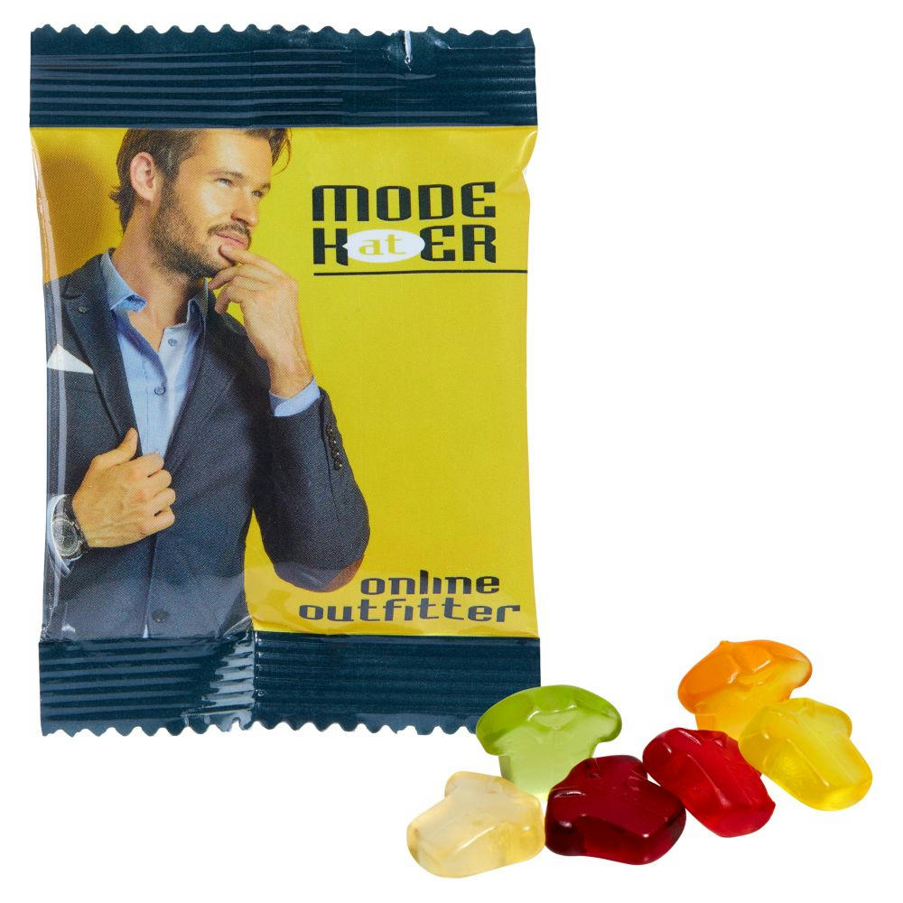 Entwickeln Sie mit uns Ihre ganz persönliche Fruchtgummi, klassisch mit Gelatine oder vegan mit Pektin, farblich und geschmacklich bunt gemischt, in glänzend- oder matt-kaschiertem, transparentem alternativ weißem Werbetütchen verpackt. Fruchtgehalt 10%. Haltbarkeit: ca. 12 Monate. Inkl. 4c-Druck. Hinweis: Produktionstechnisch bedingte Mehr- oder Mindermengen von maximal 10 % sind bei Sonderformen unvermeidbar und zu akzeptieren.