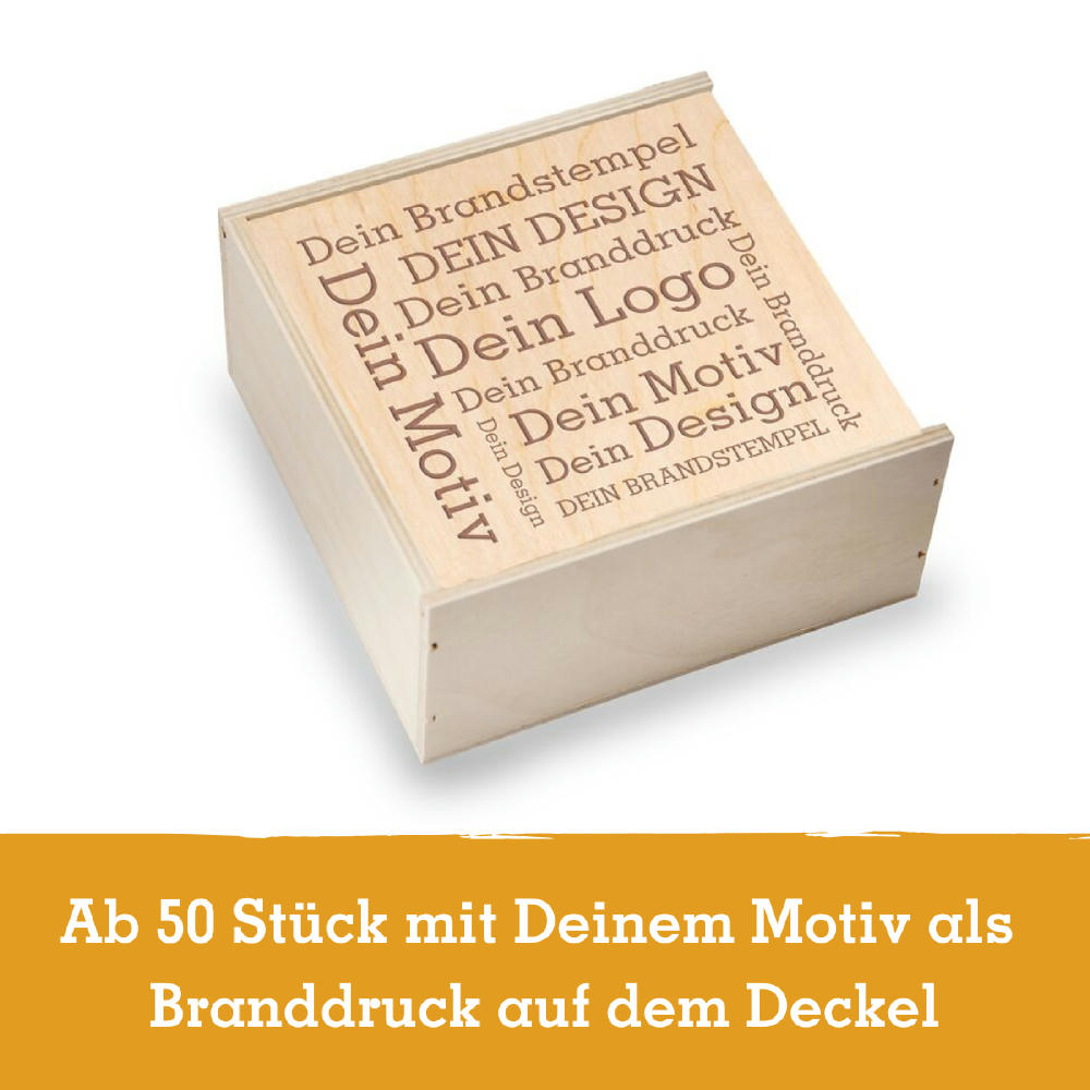 Hochwertiges Gourmetkästchen aus Birkenholz mit 4 Gewürzgläschen. Stellen Sie sich Ihr Gourmetkästchen selbst zusammen aus: Rosa Kristallsalz, Tellicherry Pfeffer, Jamaican Jerk BBQ Rub, Montreal BBQ Rub, Fränkischer BBQ Rub, Jalapeno Chili grün, Amazonas Chili, Chipotle Chili, Birds Eye Chili, Glühweingewürz, Lebkuchengewürz, Chai Tee Gewürzmischung. Die Birkenholzbox gibt es auch mit 2 oder 3 Gewürzen.Und aufgrund der edlen Verpackung kommt das Präsent auch ganz ohne Plastik aus. Inkl. Branddruck auf dem Deckel der Box.