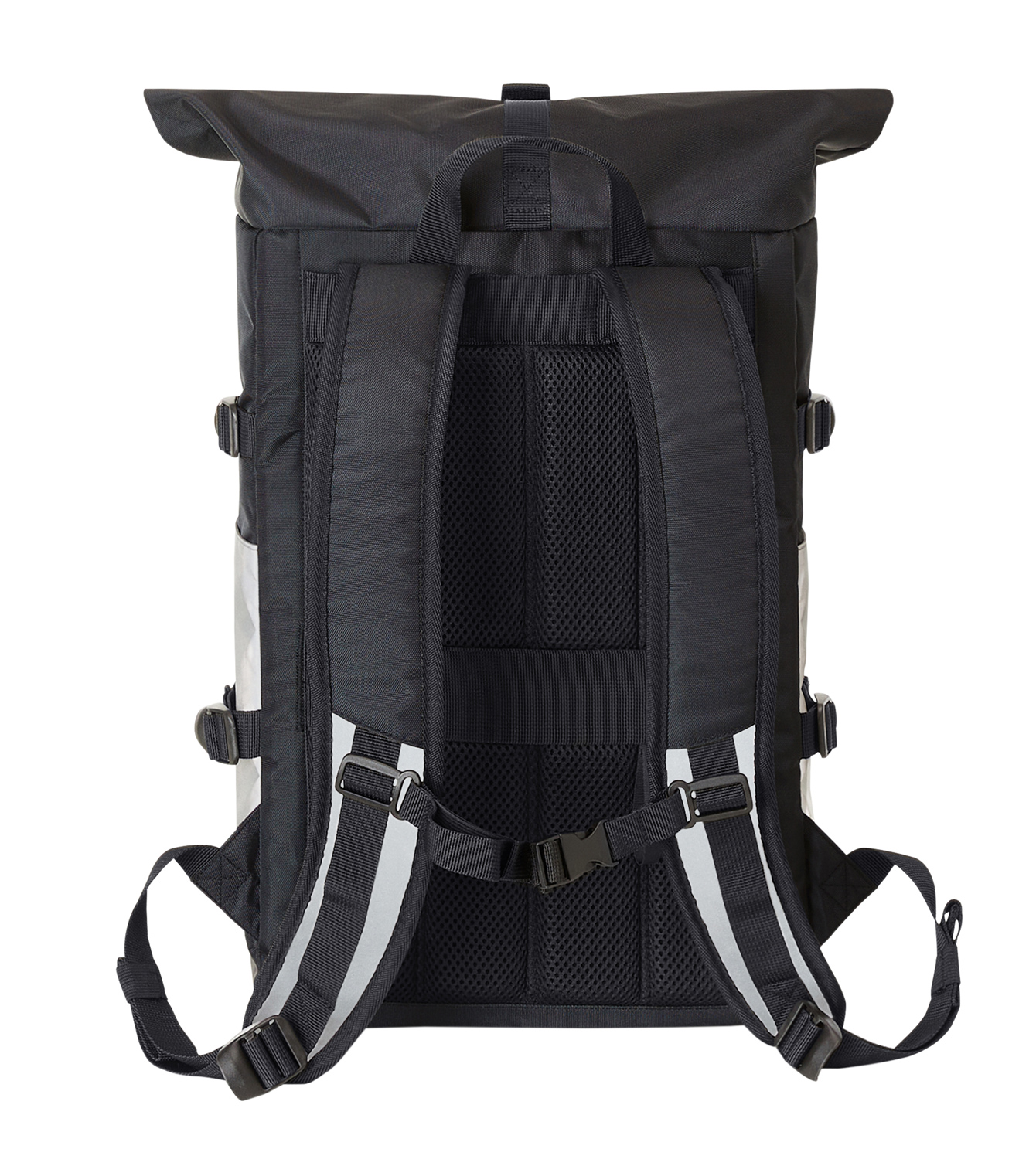 Refektierender Rolltop-Rucksack mit Reißverschluss-Hauptfach und Steckverschluss; HFL®-Träger für Ihr Logo; gepolstertes Einsteckfach und Reißverschluss-Netzfach innen; zwei seitliche Einsteckfächer; Fixiergurte; Reißverschluss-Vortasche; LED-Fahrradlicht-Befestigungsmöglichkeit; rückseitige Befestigungsschlaufe für Trolley-Gestänge; verstecktes Reißverschluss-Fach; gepolstertes Tragesystem mit höhenverstellbarem Brustgurt; Handgriff.