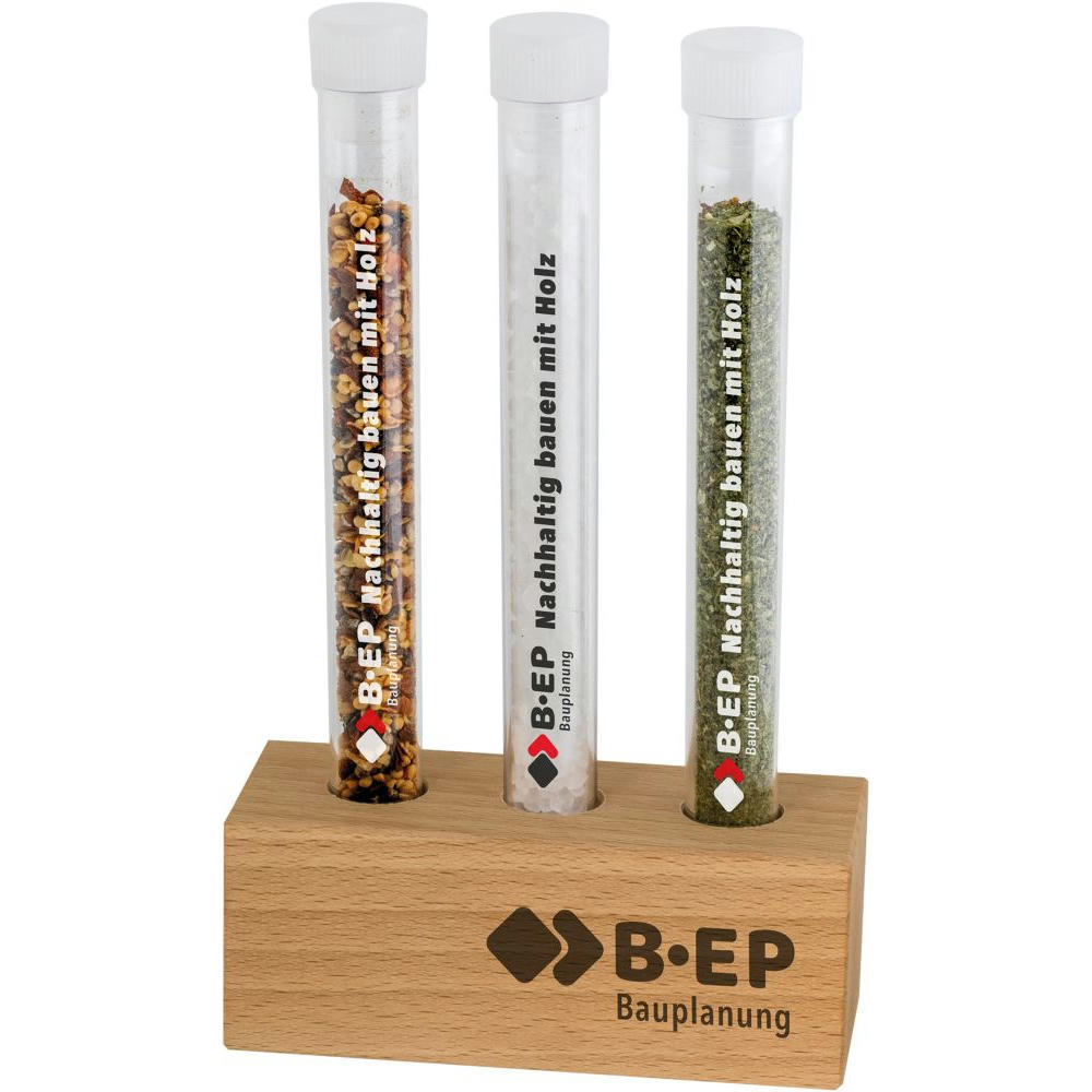 Edler und nachhaltiger Aufsteller aus geöltem Buchenholz für 3 Reagenzgläser. Veredelung des Aufstellers auf Anfrage. Exkl. Reagenzgläser.