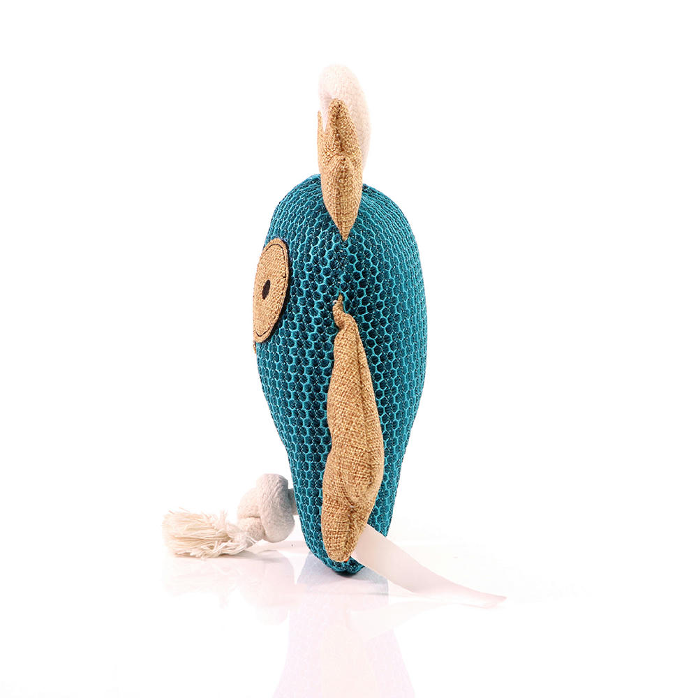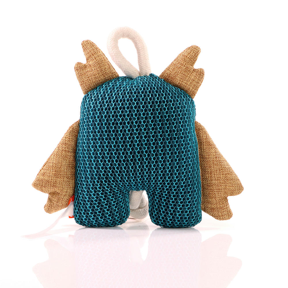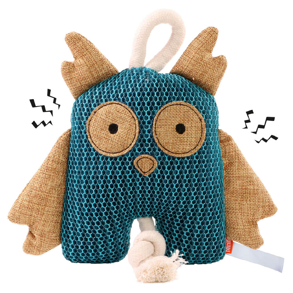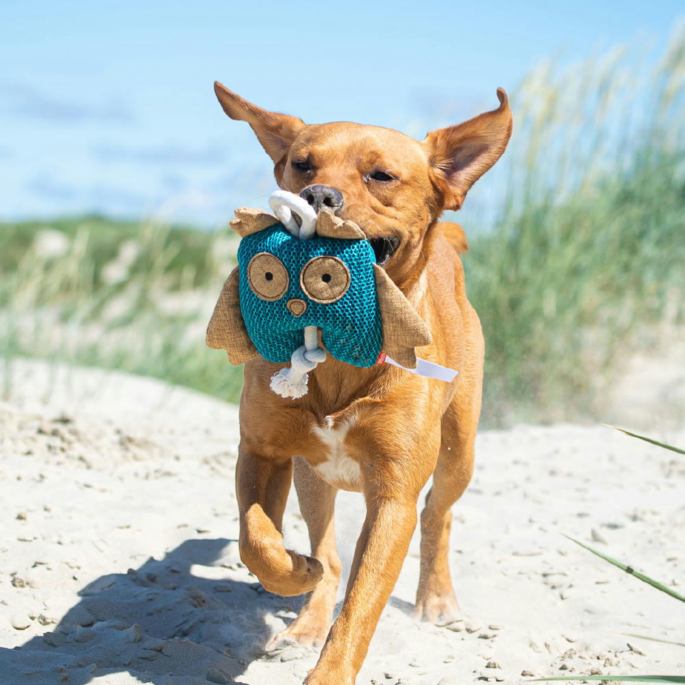 Die Eule ist das Highlight in jeder Spielkiste. Blau in Kombination mit Details aus Jute, spannenden Knotenelementen und seiner Knisterfunktion, wird der Spieltrieb großer und kleiner Hunde gefordert und gefördert.