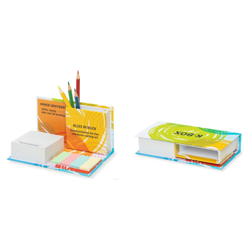 Mobiles Büro aus ECO-Papier. Die Ummantelung ist aus 100% recyceltem Papier in Weiß Inhalt: Notizblock (225 Blatt), Indexstreifen (4 x 25 St.) und Ablage für Schreibgeräte (auch mit Haftnotizen möglich).