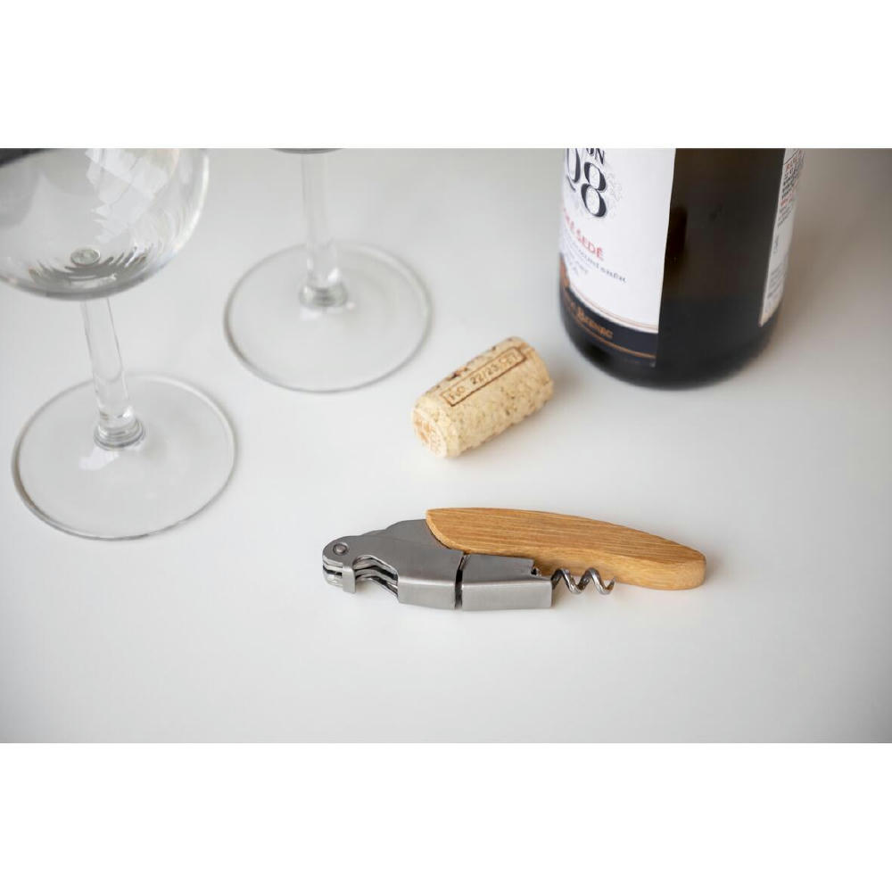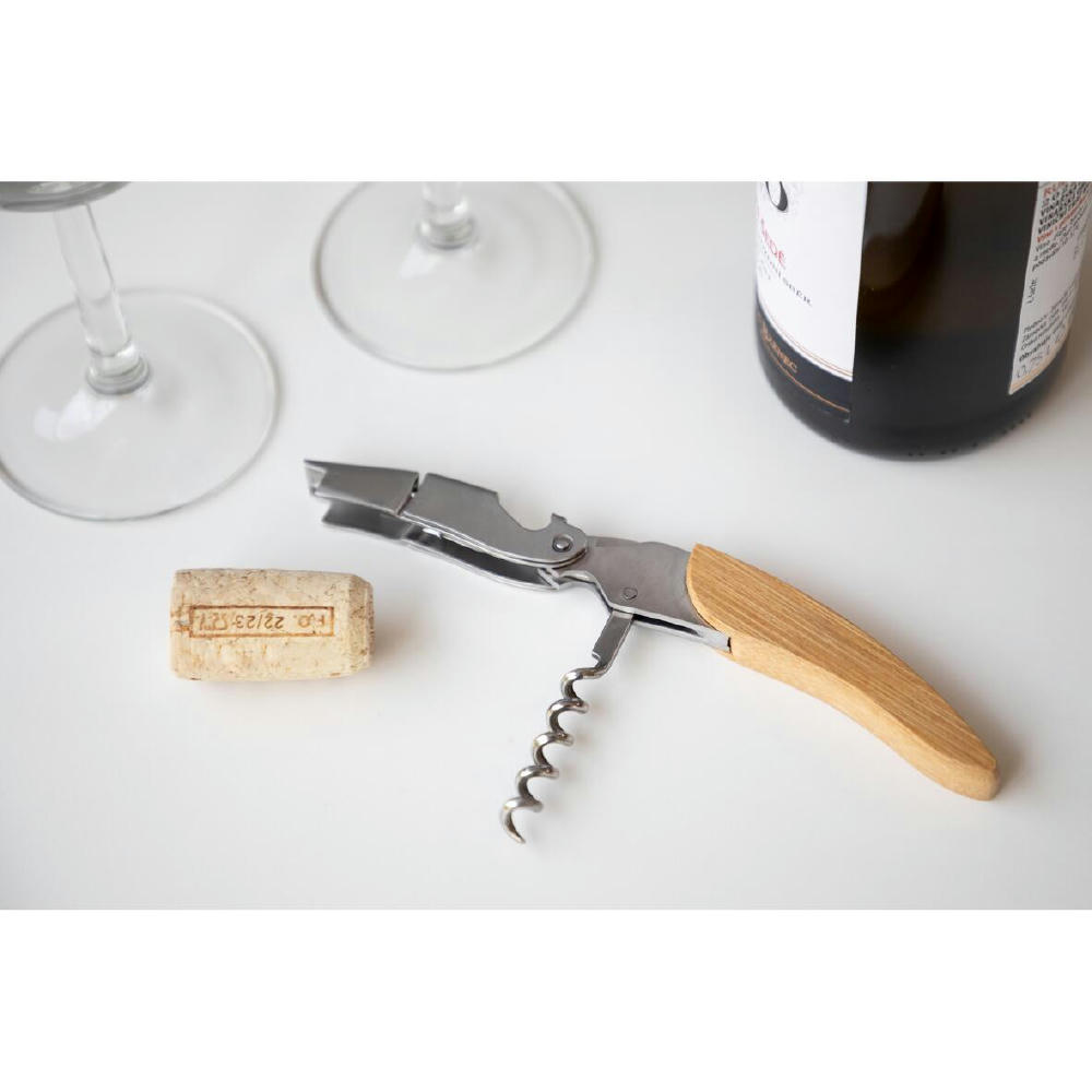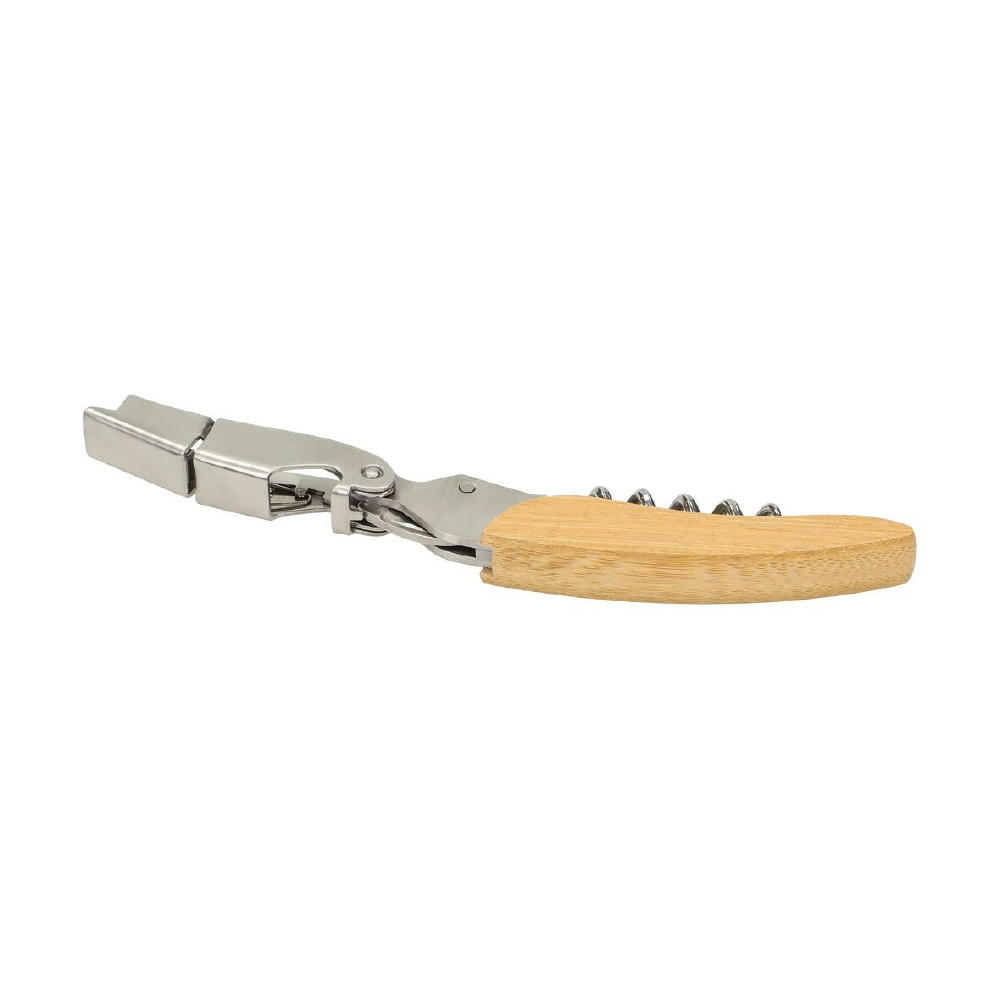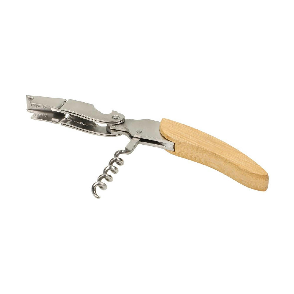 Das Kellnermesser kombiniert Bambus und Edelstahl für eine elegante und langlebige Ausführung. Es vereint Flaschenöffner und einen Kapselschneider in einem Produkt. Der spiralförmige Korkenzieher mit Hebelmechanismus ermöglicht ein einfaches und kraftsparendes Entkorken. Dieses funktionale Werkzeug ist ideal für Weinliebhaber und Profis.