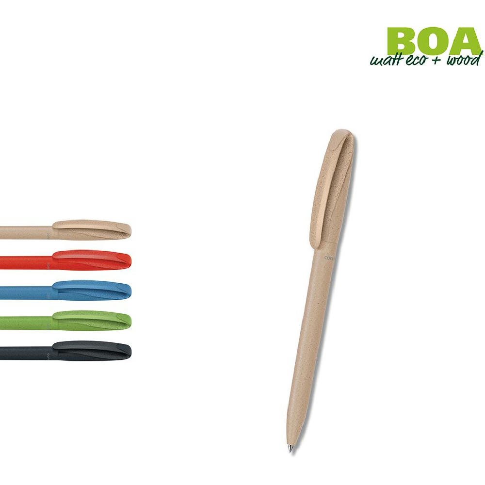 Der Boa matt eco + wood ist ein Drehkugelschreiber. Materialien und Oberflächen: Schaft und Oberteil: biobasierter Kunststoff aus Nachwachsenden Rohstoffen, unter anderem mit Holzfaserabfall der regionalen Sägeindustrie, matt. Oberteil: Mix aus matten und glänzenden Flächen. Minenröhrchen: Recyceltes Polypropylen (rPP). Standardfarben: Schaft und Oberteil: aus 5 Farben kombinierbar. Hinweis: Aufgrund der organischen Rohstoffe kann es zu Farbabweichungen auch bei einzelnen Bauteilen eines Produktes kommen. Sonderfarben: - Standardmine: Silktech L (3.000 m), blau oder schwarz, Mine optional: Silktech XL, Multifill P, Multi-Gel.