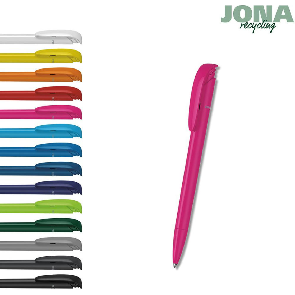 Der Jona recycling ist ein Druckkugelschreiber. Materialien und Oberflächen: Spitze, Schaft und Drückerklipp: Kunststoff (rABS) hochglänzend, recycelt. Minenröhrchen: Recyceltes Polypropylen (rPP). Standardfarben: Spitze, Schaft und Drückerklipp: aus 14 Farben kombinierbar. Hinweis: Aufgrund der recycelten Rohstoffe kann es zu Farbabweichungen auch bei einzelnen Bauteilen eines Produktes kommen. Sonderfarben: ab 3.000 Stück, ab 25.000 Stück ohne PMS-Zuschlag. Standardmine: Silktech L (3.000 m), blau oder schwarz, Mine optional: Silktech XL, Multifill P, Multi-Gel.