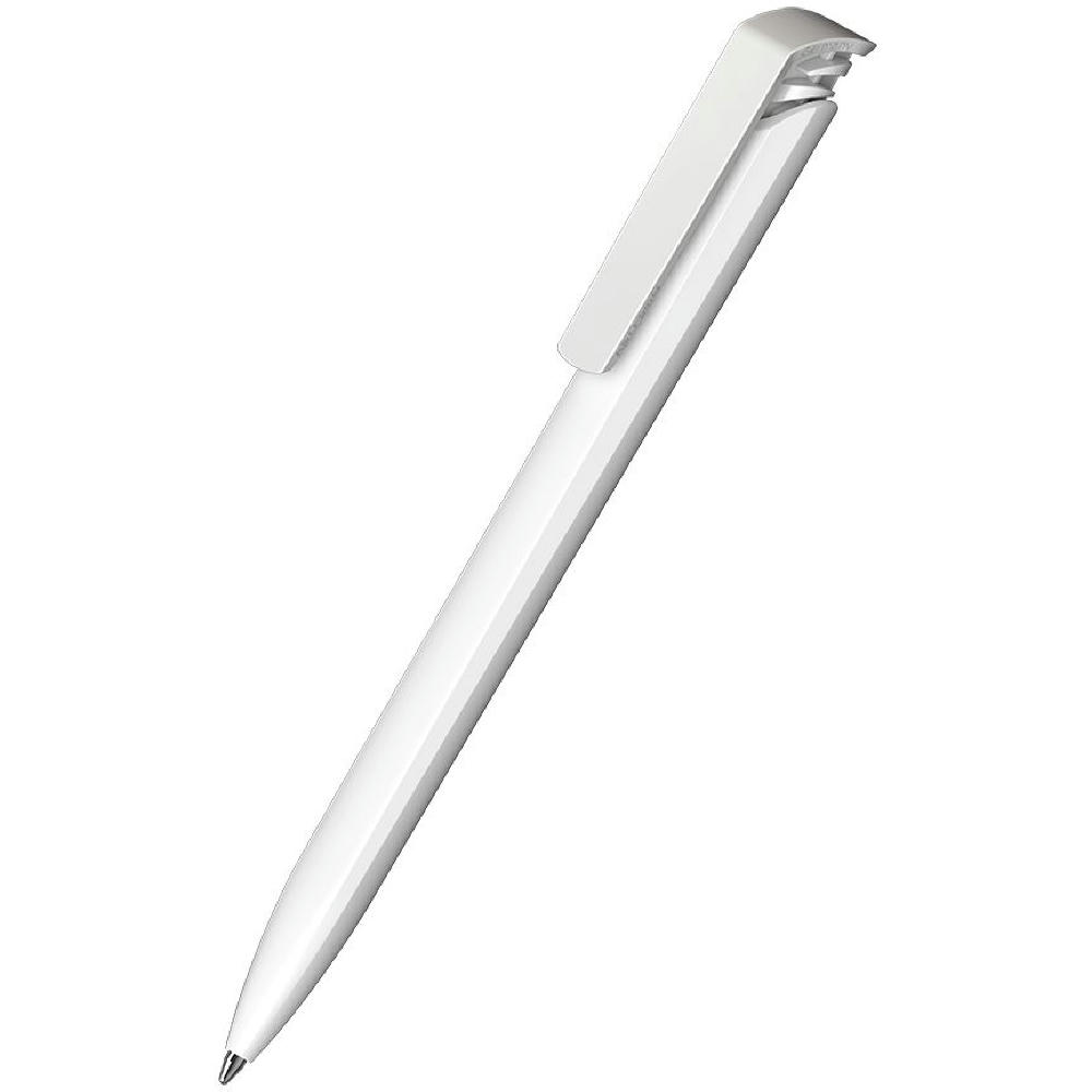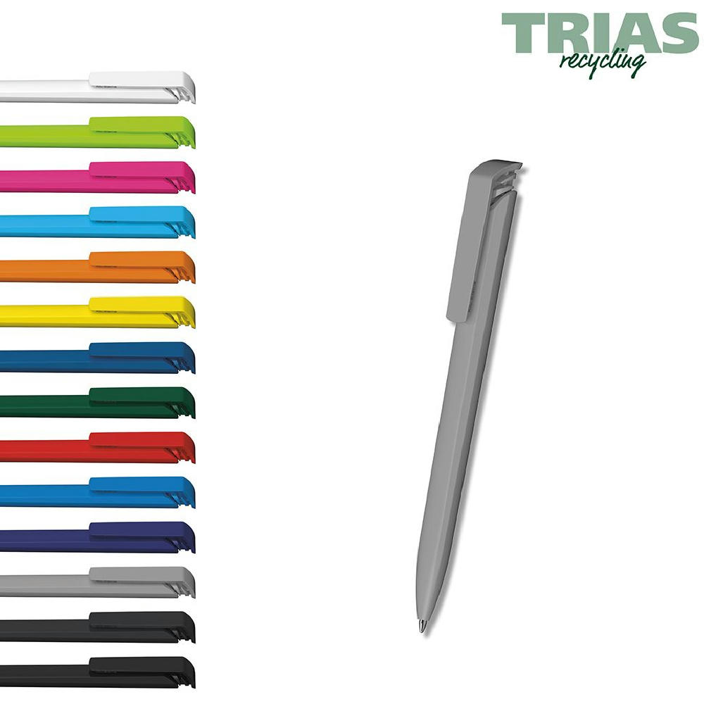 Der Trias recycling ist ein Druckkugelschreiber. Materialien und Oberflächen: Schaft und Drückerklipp: Kunststoff (rABS) hochglänzend, recycelt. Minenröhrchen: Recyceltes Polypropylen (rPP). Standardfarben: Schaft und Drückerklipp: aus 14 Farben kombinierbar. Hinweis: Aufgrund der recycelten Rohstoffe kann es zu Farbabweichungen auch bei einzelnen Bauteilen eines Produktes kommen. Sonderfarben: ab 3.000 Stück, ab 25.000 Stück ohne PMS-Zuschlag. Standardmine: Silktech L (3.000 m), blau oder schwarz, Mine optional: