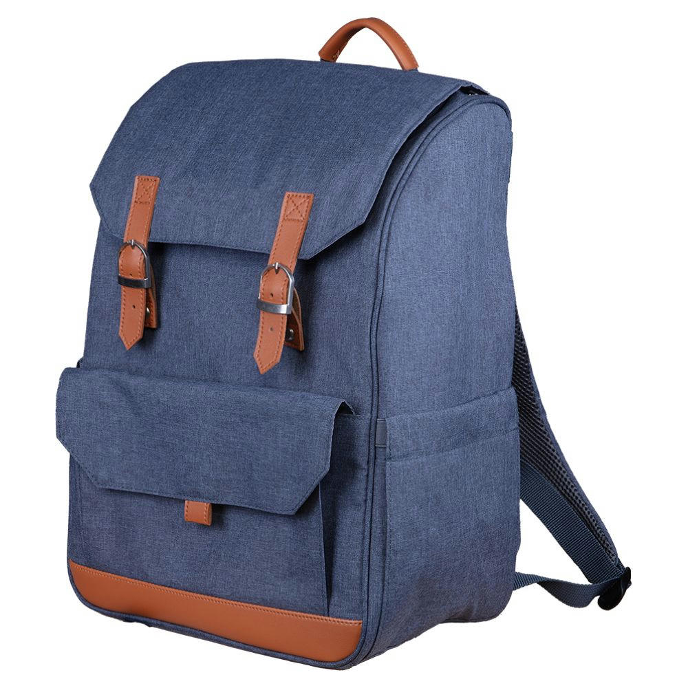 Kühlrucksack aus recyceltem Polyester 300D (RPET) mit hellbraunen Kunstleder-Schnallen, thermoisoliertem Innenraum (PEVA), sowie einem Front-Klettfach und zwei Seitentaschen für Flaschen, Schirme etc.