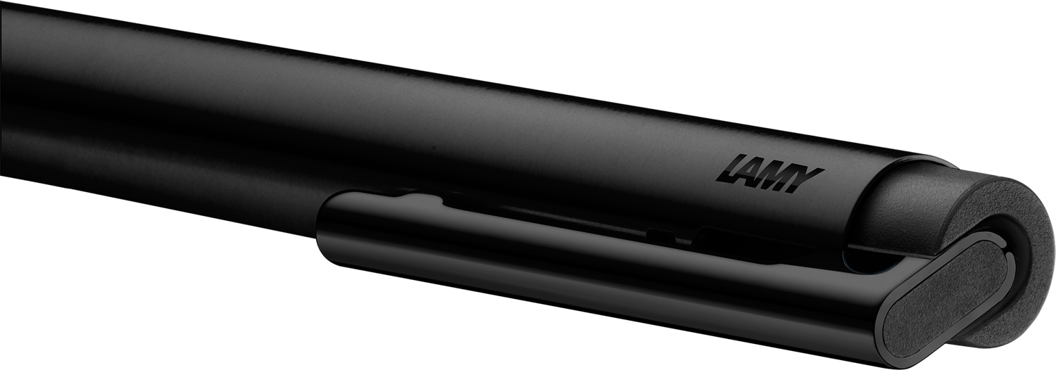 Kugelschreiber aus rostfreiem Edelmetall, mattschwarz pulverbeschichtet und mit schwarzem LAMY-Emblem. Abgefederter Stahlclip mit Druckmechanik und integrierter Clip-Drücker-Einheit. Erhältlich mit schwarzer oder blauer Mine. Bei Veredelung mit Lasergravur erscheint die Gravur in Gold.