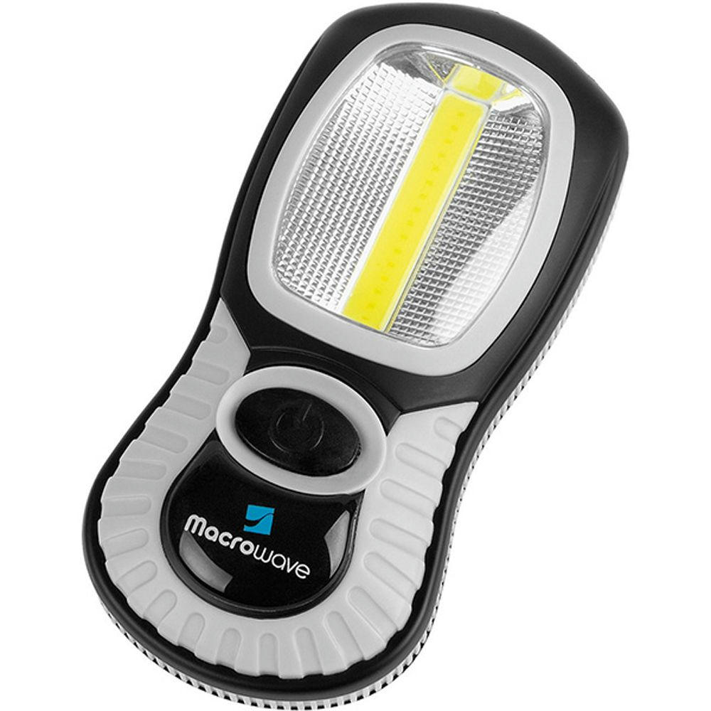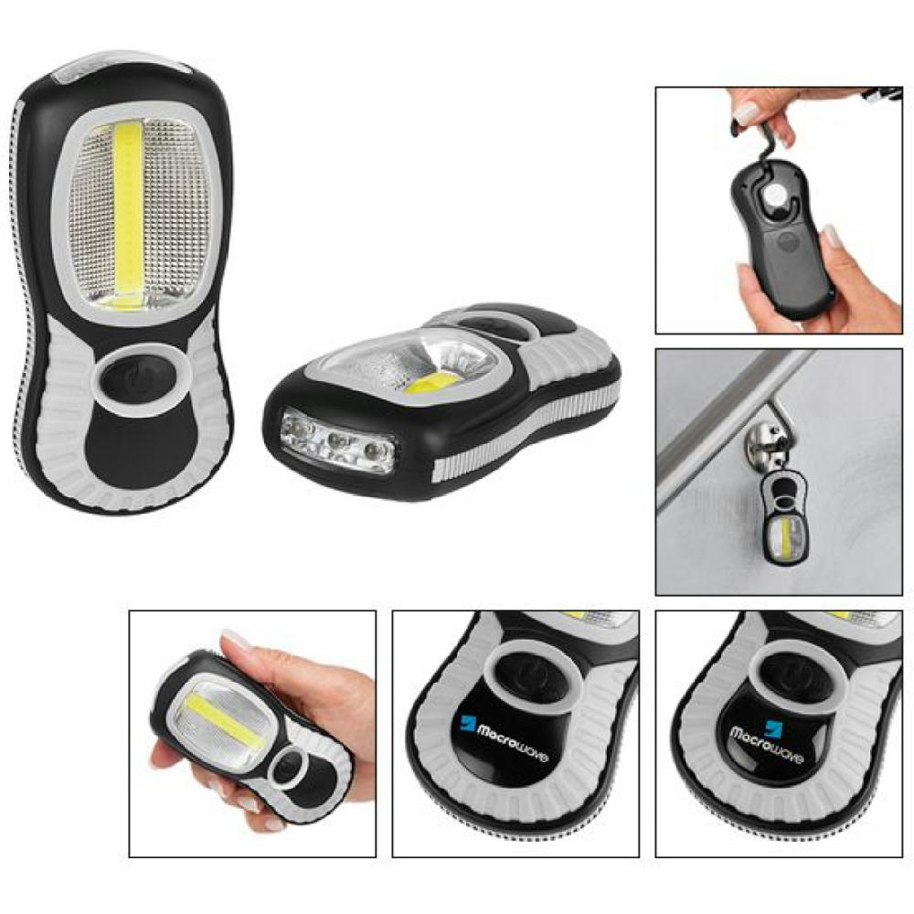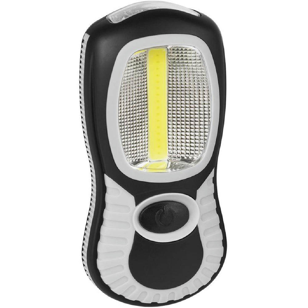 Arbeitsleuchte mit 3W COB LE D und 3 DIP LE D. Lichtwerte: Arbeitsleuchte 230 Lumen, Taschenleuchte 30 Lumen. Leuchtdauer: ca. 20 Std. Leuchtmodi: 100% Power weißes Licht. Starker vernickelter Magnet, 360° drehbarer Fixierhaken. Inkl. 3 AAA Batterien. In schwarzer Geschenkverpackung.