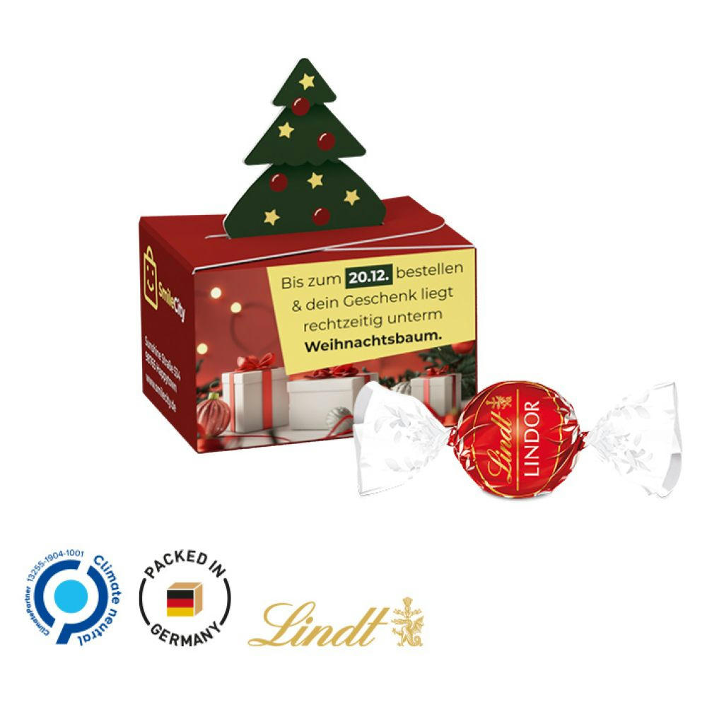 Lindor Milchkugel in einer Werbebox aus weißem Karton, Verschluss mit einem aufgestellten Tannenbaum, Box individuell bedruckt. Inhalt: 1 LINDOR Milchkugel, 12,5 g. Saisonartikel - solange der Vorrat reicht!