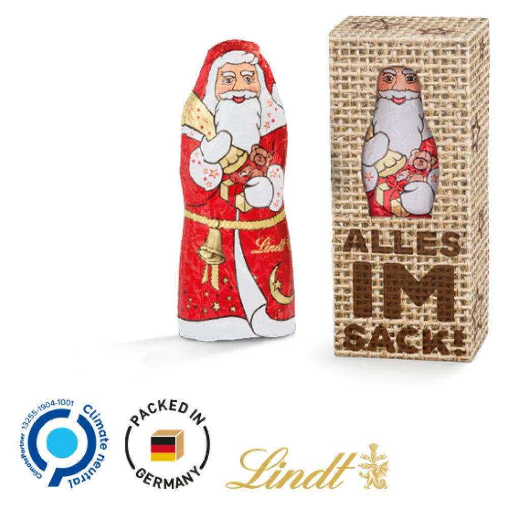 LINDT Schoko Weihnachtsmann in einer Werbebox aus weißem Karton, individuell bedruckt. Inhalt: LINDT Weihnachtsmann aus Vollmilchschokolade, 10 g. Saisonartikel - solange der Vorrat reicht!