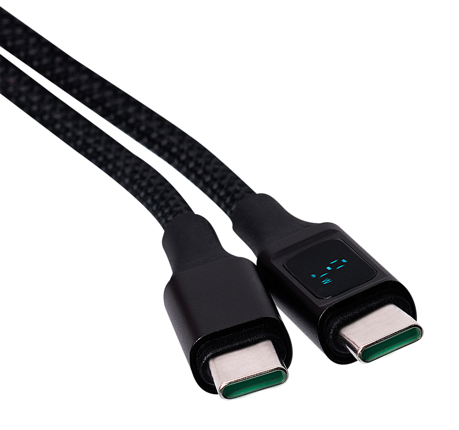 Ladekabel mit bis zu 100W Kapazität. Datenübertragung bis zu 480 mbps. Auf der Digitalanzeige kann abgelesen werden mit wieviel Watt das Gerät geladen wird. Stabile, gewobene Nylonummantelung. Länge 1 m