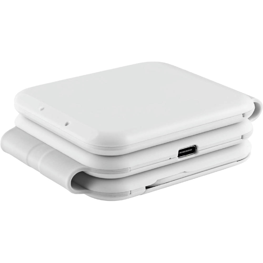 Faltbares sehr kompaktes Ladepad mit 2 Lademöglichkeiten - Wireless charging pad (15 Watt High speed) für Ihr kompatibles Smartphone, 2,5 Watt wireless pad für die Apple® Watch und kompatible Geräte - inkl. Kabel/Steckersatz zum Anschluss wirklich aller Geräte. Aus RABS Kunststoff (Recyclinganteil >20 %), im Designkarton