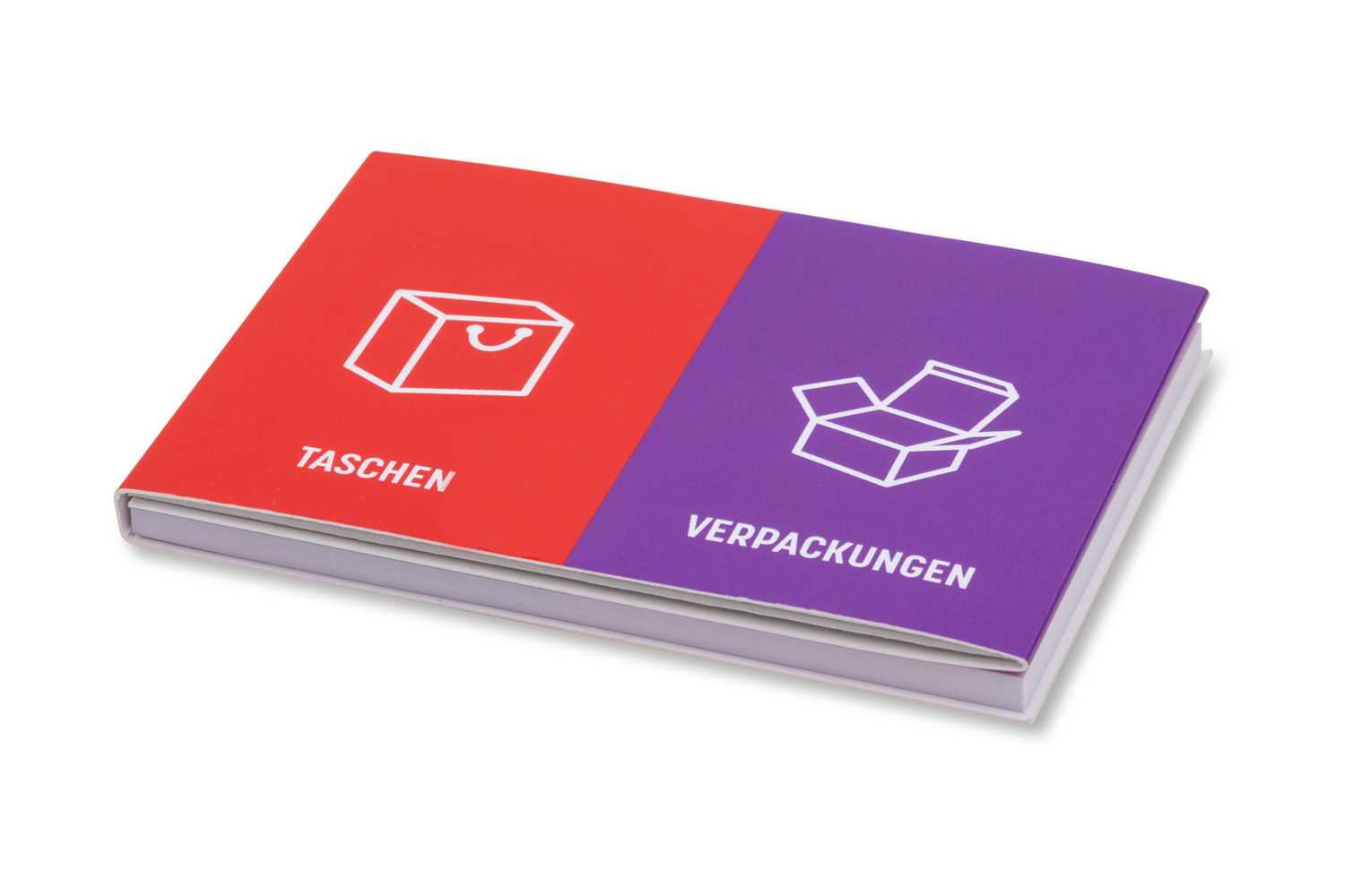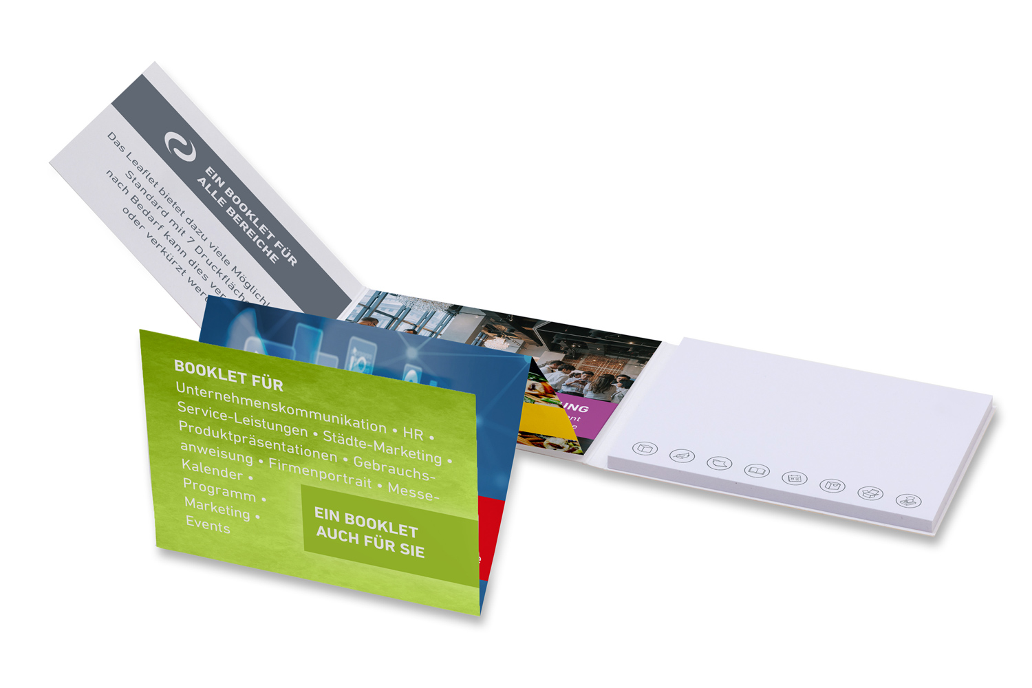 Kartoncover-Leporello seitlich zu öffnen, mit Haftnotizen + Leaflet.Haftnotizen innen rechts mit 50 Blatt 10 x7,5 cm, weiß, 80g und 2-farbigem Druck, einseitig. Leaflet gefaltet mit 7 Druckflächen à 10 x 7,5 cm, Bilderdruckpapier 130g und 4-farbigem Druck, beidseitig. Kartoncover mit 4-farbigem Druck. Einzeln mit Banderole verschlossen.